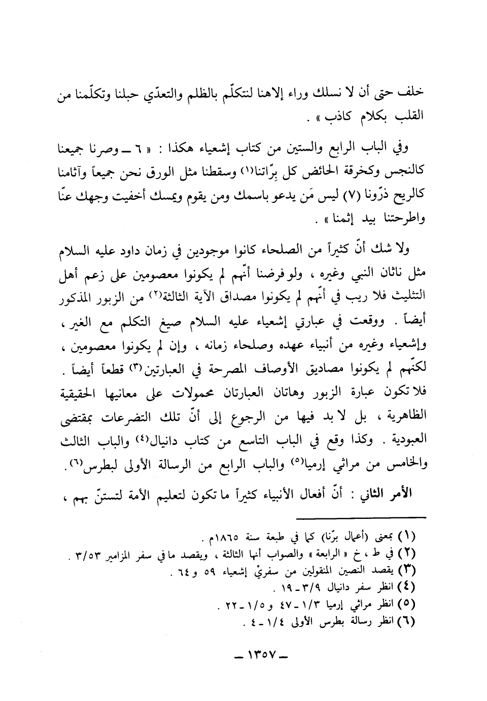وفي الباب الرابع والستين من كتاب أشعيا هكذا: 6 (وصرنا جميعنا كالنجس وكخرقة الحائض كل براتنا وسقطنا مثل الورق نحن جميعاً وآثامنا كالريح ذرونا) 7 (ليس من يدعو باسمك ومن يقوم ويمسكك أخفيت وجهك عنا واطرحتنا بيد إثمنا) .. ولا شك أن كثيراً من الصلحاء كانوا موجودين في زمان داود عليه السلام، مثل ناثان النبي وغيره، ولو فرضنا أنهم لم يكونوا معصومين على زعم أهل التثليث، فلا ريب أنهم لم يكونوا مصداق الآية الرابعة من الزبور المذكور أيضاً، ووقعت في عبارتي أشعيا عليه السلام، صيغ التكلم مع الغير، وأشعيا وغيره من أنبياء عهده وصلحاء زمانه، وإن لم يكونوا معصومين لكنهم لم يكونوا مصاديق الأوصاف المصرحة، في العبارتين قطعاً أيضاً، فلا تكون عبارة الزبور وهاتان العبارتان محمولات على معانيها الحقيقية الظاهرية، بل لا بد فيها من الرجوع إلى أن تلك التضرعات بمقتضى العبودية. وكذا وقع في الباب التاسع من كتاب دانيال، والباب الثالث والخامس من مراثي أرمياء، والباب الرابع من الرسالة الأولى لبطرس.