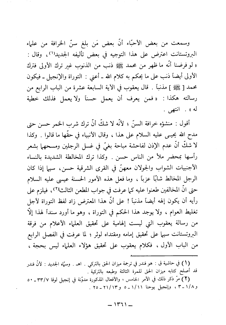أقول: هذا منشؤه خرافة السن، لأنه لا شك أن ترك شرب الخمر حسن، حتى مدح الله يحيى عليه السلام على هذا، وقال الأنبياء في حقها ما قالوا، وكذا لا شك أن عدم الإذن لفاحشة مباحة بغي في غسل الرجلين ومسحهما بشعر رأسها بمحضر ملأ من الناس حسن. وكذا ترك المخالفة الشديدة بالنساء الأجنبيات الشواب، والجولان معهن في القرى الشرقية حسن، سيما إذا كان الرجل المخالط شاباً عزباً. وما فعل هذه الأمور الحسنة عيسى عليه السلام، حتى أن المخالفين طعنوا عليه كما عرفت في جواب المطعن الثالث، فيلزم على رأيه أن يكون إلهه أيضاً مذنباً. على أن هذا المعترض زاد لفظ التوراة لأجل تغليط العوام، ولا يوجد هذا الحكم في التوراة، وهو ما أورد سنداً لهذا، إلا من رسالة يعقوب التي ليست إلهامية، على تحقيق العلماء الأعلام من فرقة بروستنت، سيما على تحقيق إمامه ومقتداه لوطر، كما عرفت في الفصل الرابع من الباب الأول. فكلام يعقوب على هؤلاء العلماء ليس بحجة