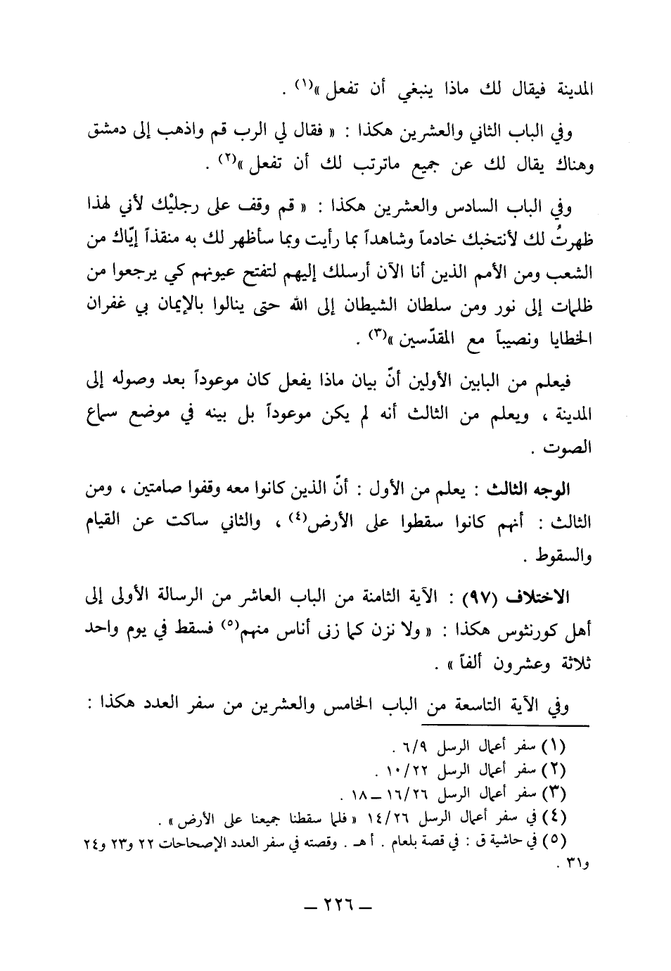 المدينة فيقال لك ماذا ينبغي أن تفعل" وفي الباب الثاني والعشرين هكذا: "قال لي الرب قم واذهب إلى دمَشق، وهناك يقال لك عن جميع ما ترتب لك أن تفعل" وفي الباب السادس والعشرين هكذا: "قم وقف على رجليك لأني لهذا ظهرت لك لانتخبك خادماً وشاهداً بما رأيت وبما سأظهر لك به منقذاً إياك من الشعب، ومن الأمم الذين أنا الآن أرسلك إليهم لتفتح عيونَهم كي يرجعوا من ظلمات إلى نور ومن سلطان الشيطان إلى الله، حتى ينالوا بالإيمان بي غفران الخطايا ونصيباً مع المقدسين" فيعلم من البابين الأولين أن بيان ماذا يفعل كان موعوداً بعد وصوله إلى المدينة، ويعلم من الثالث أنه لم يكن موعوداً بل بينه في موضع سماع الصوت الثالث يعلم من الأول أن الذين كانوا معه وقفوا صامتين، ويُعلم من الثالث أنهم كانوا سقطوا على الأرض والثاني ساكت عن القيام والسقوط.