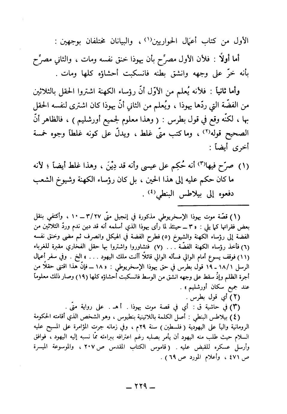 الأول من كتاب أعمال الحواريين، والبيانان مختلفان بوجهين: أما أولاً: فلأن الأول مصرح بأن يهودا خنق نفسه ومات والثاني مصرح (بأنه خر على وجهه وانشق بطنه فانكبت أحشاؤه كلها ومات) ، وأما ثانياً: فلأنه يعلم من الأول أن رؤساء الكهنة اشتروا الحقل بالثلاثين من الفضة التي ردها يهودا، ويعلم من الثاني أن يهودا كان اشترى لنفسه الحقل بها لكنه وقع في قول بطرس (وهذا معلوم لجميع سكان أورشليم) فالظاهر أن الصحيح قوله وما كتب متى غلط، ويدل على كونه غلطاً وجوه خمسة أخرى أيضاً [1] صرح فيها أنه حكم على عيسى وأنه قد دِين، وهذا غلط أيضاً لأنه ما كان حكم عليه إلى هذا الحين، بل كان رؤساء الكهنة وشيوخ الشعب دفعوه إلى بيلاطس النبطي. [2]