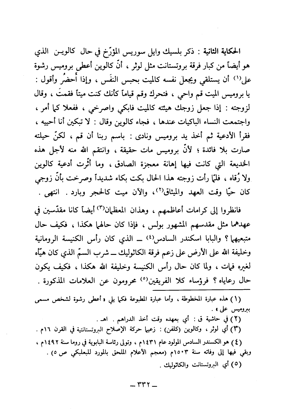 الحكاية الثانية "ذكر بلسيك وايل سوريس المؤرخ في حال كالوين الذي هو أيضاً من كبار فرقة البروتستنت مثل لوطر أن كالوين أعطى رشوة لشخص مسمى ببروميس على أن يستلقي ويجعل نفسه كالميت بحبس النفس، وإذا أحضر وأقول يا بروميس الميت قم وأحي فتحرك وقم قياماً مّا كأنك كنت ميتاً فقمت، وقال لزوجته إذا جعل زوجك هيئته كالميت فابكي واصرخي، ففعلا كما أمر واجتمعت النساء الباكيات عندها فجاء كالوين وقال لا تبكين أنا أحييته، فقرأ الأدعية، ثم أخذ يد بروميس ونادى باسم ربنا أن قم، لكن حيلته صارت بلا فائدة لأن بروميس مات حقيقة، وانتقم الله منه لأجل هذه الخديعة التي كانت فيها إهانة معجزة الصادق، وما أثرت أدعية كالوين ولا وقاه، فلما رأت زوجته هذا الحال بكت بكاء شديداً وصرخت بأن زوجي كان حياً وقت العهد والميثاق، والآن أميت كالحجر وبارد" فانظروا إلى كرامات أعاظمهم، وهذان المعظمان أيضاً كانا مقدسين في عهدهما مثل مقدسهم المشهور بولس، فإذا كان حالهما هكذا فكيف حال متبعيهما؟ والبابا اسكندر السادس الذي كان رأس الكنيسة الرومانية وخليفة الله على الأرض على زعم فرقة الكاثلك شرب السم الذي كان هيأه لغيره فمات، ولما كان حال رأس الكنيسة وخليفة الله هكذا فكيف يكون حال رعاياه؟ فرؤساء كلا الفريقين محرومون من العلامات المذكورة.