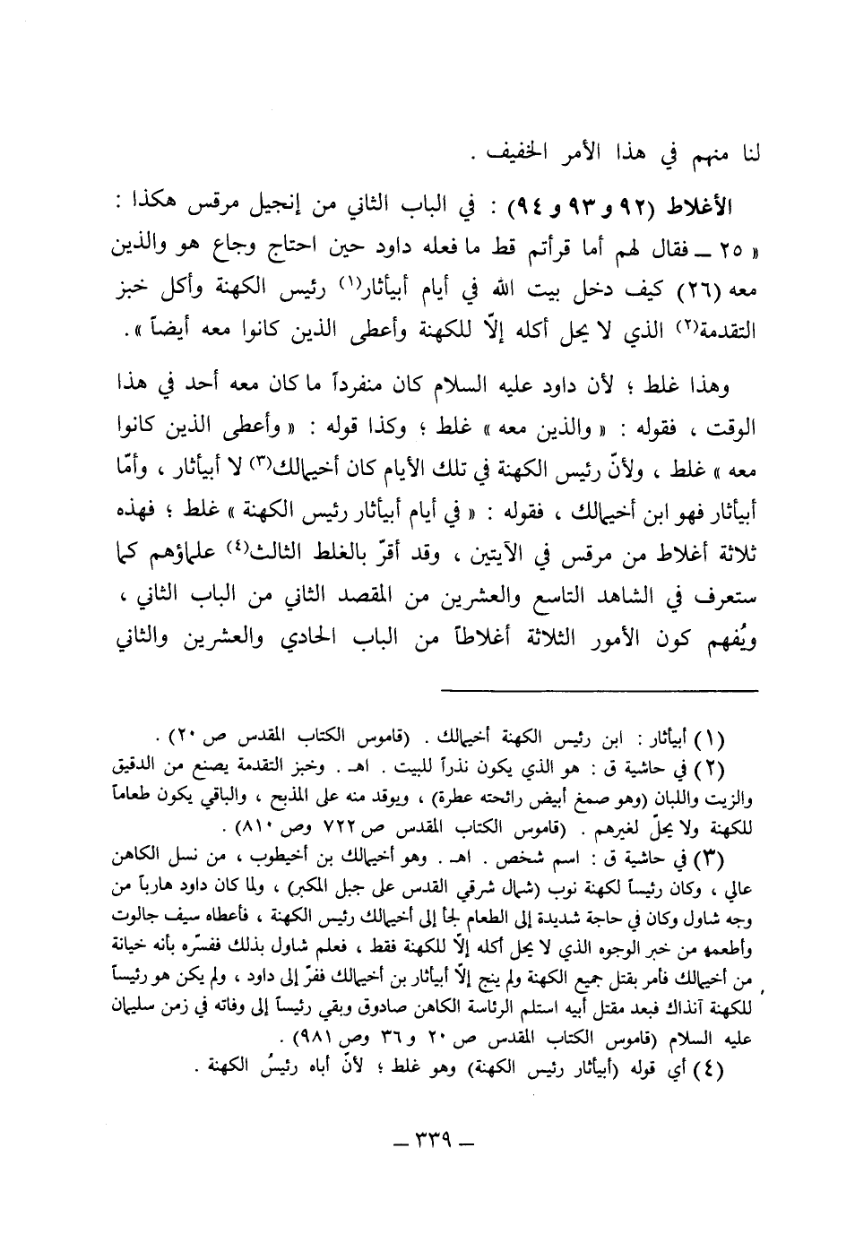 الغلط [92] و [93] و [94] في الباب الثاني من إنجيل مرقس هكذا: 25 "فقال لهم أما قرأتم قط ما فعله داود حين احتاج وجاع هو والذين معه" 26 "كيف دخل بيت الله في أيام أبياثار رئيس الكهنة وأكل خبز التقدمة الذي لا يحل أكله إلا للكهنة وأعطى الذين كانوا معه أيضاً". وهذا غلط لأن داود عليه السلام كان منفرداً ما كان معه أحد في هذا الوقت فقوله (والذين معه) غلط وكذا قوله (وأعطى الذين كانوا معه) غلط، ولأن رئيس الكهنة في تلك الأيام كان أخا ملك لا أبياثار، وأما أبياثار فهو ابن أخي ملك فقوله (في أيام أبياثار رئيس الكهنة) غلط، فهذه ثلاثة أغلاط من مرقس في الآيتين، وقد أقر بالغلط الثالث علماؤهم كما ستعرف في الشاهد التاسع والعشرين من المقصد الثاني من الباب الثاني، ويفهم كون الأمور الثلاثة أغلاطاً من الباب الحادي والعشرين والثاني