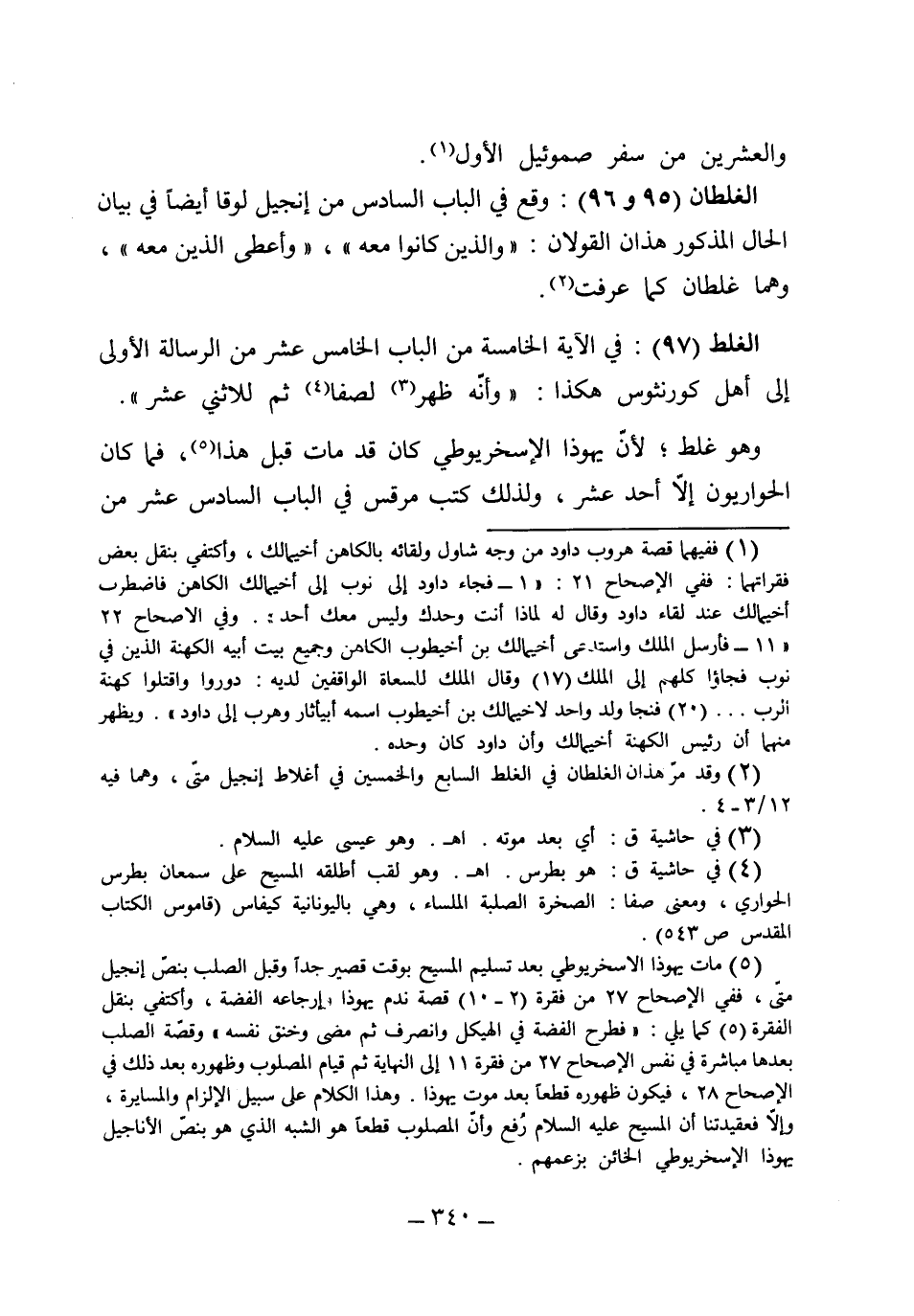 الغلط [97] في الآية الخامسة من الباب الخامس عشر من الرسالة الأولى إلى أهل قورنيثوس هكذا: "وأنه ظهر لصفا ثم للاثني عشر" وهو غلط، لأن يهودا الأسخريوطي كان قد مات قبل هذا فما كان الحواريون إلا أحد عشر ولذلك كتب مرقس في الباب السادس عشر من