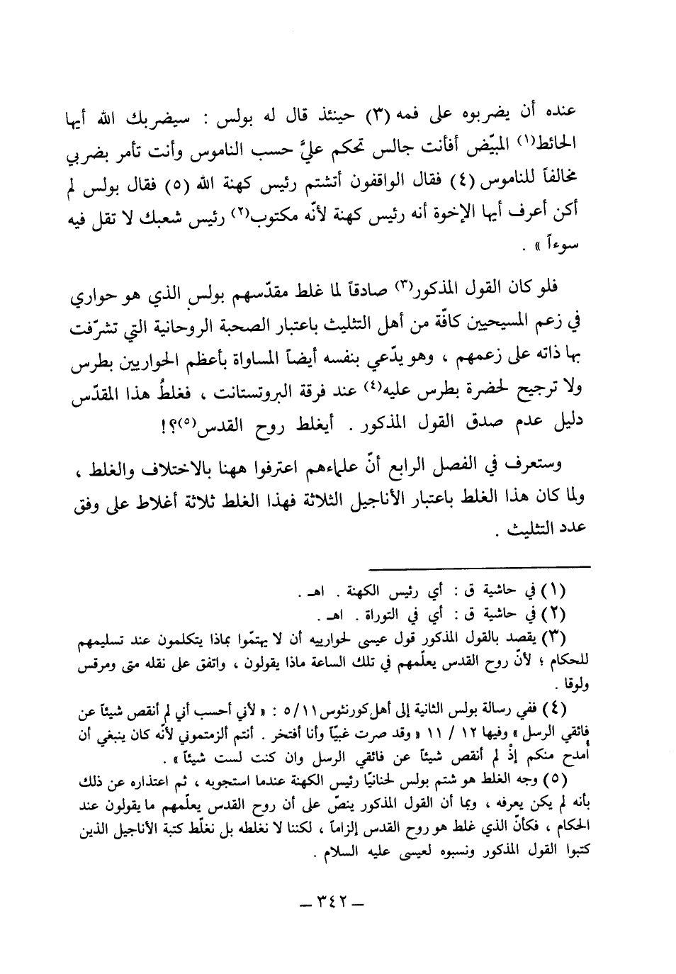 عنده أن يضربوه على فمه" 3 "حينئذ قال له بولس سيضربك الله أيها الحائط المبيض أفأنت جالس تحكم على حسب الناموس وتأمر بضربي مخالفاً للناموس" 4 "فقال الواقفون أتشتّم رئيس كهنة الله" 5 "فقال بولس لم أكن أعرف أيها الأخوة أنه رئيس كهنة لأنه مكتوب رئيس شعبك لا تقل فيه سوءاً" فلو كان القول المذكور صادقاً لما غلط مقدسهم بولس الذي هو حواري في زعم المسيحيين كافة من أهل التثليث باعتبار الصحبة الروحانية التي تشرفت بها ذاته على زعمهم، وهو يدعي بنفسه أيضاً المساواة بأعظم الحواريين بطرس، ولا ترجيح لحضرة بطرس عليه عند فرقة البروتستنت، فغلط هذا المقدس دليل عدم صدق القول المذكور، أيغلط روح القدس؟، وستعرف في الفصل الرابع أن علماءهم اعترفوا ههنا بالاختلاف والغلط، ولما كان هذا الغلط باعتبار