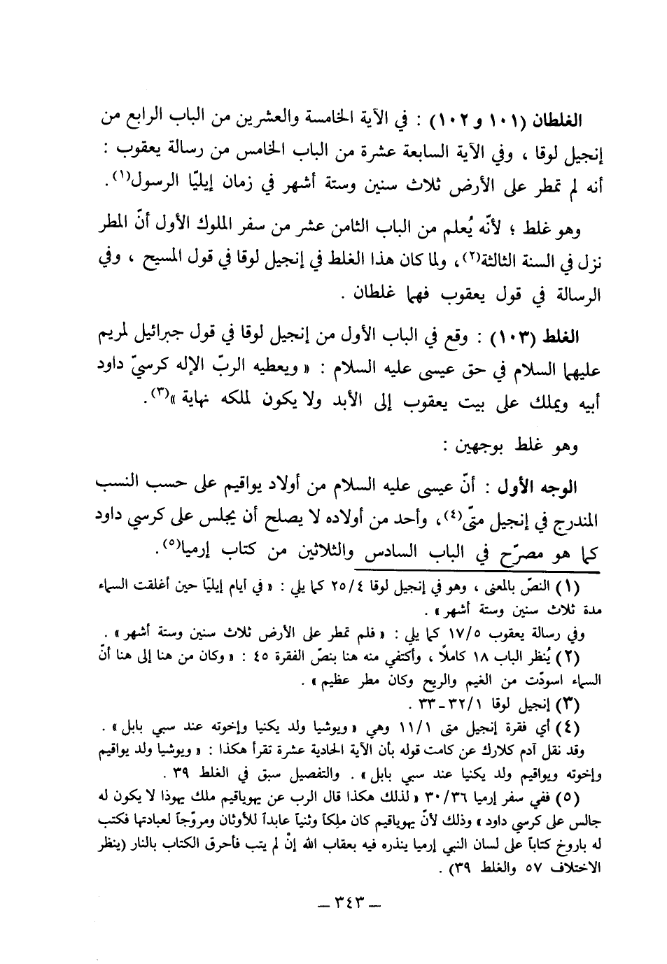 الغلط [103] وقع في الباب الأول من إنجيل لوقا في قول جبرائيل لمريم عليهما السلام في حق عيسى عليه السلام: "ويعطيه الرب الإله كرسي داود أبيه ويملك على بيت يعقوب إلى الأبد ولا يكون لملكه نهاية" وهو غلط بوجهين: (الأول) أن عيسى عليه السلام من أولاد يواقيم على حسب النسب المندرج في إنجيل متى وأحد من أولاده لا يصلح أن يجلس على كرسي داود، كما هو مصرح في الباب السادس والثلاثين من كتاب أرمياء.
