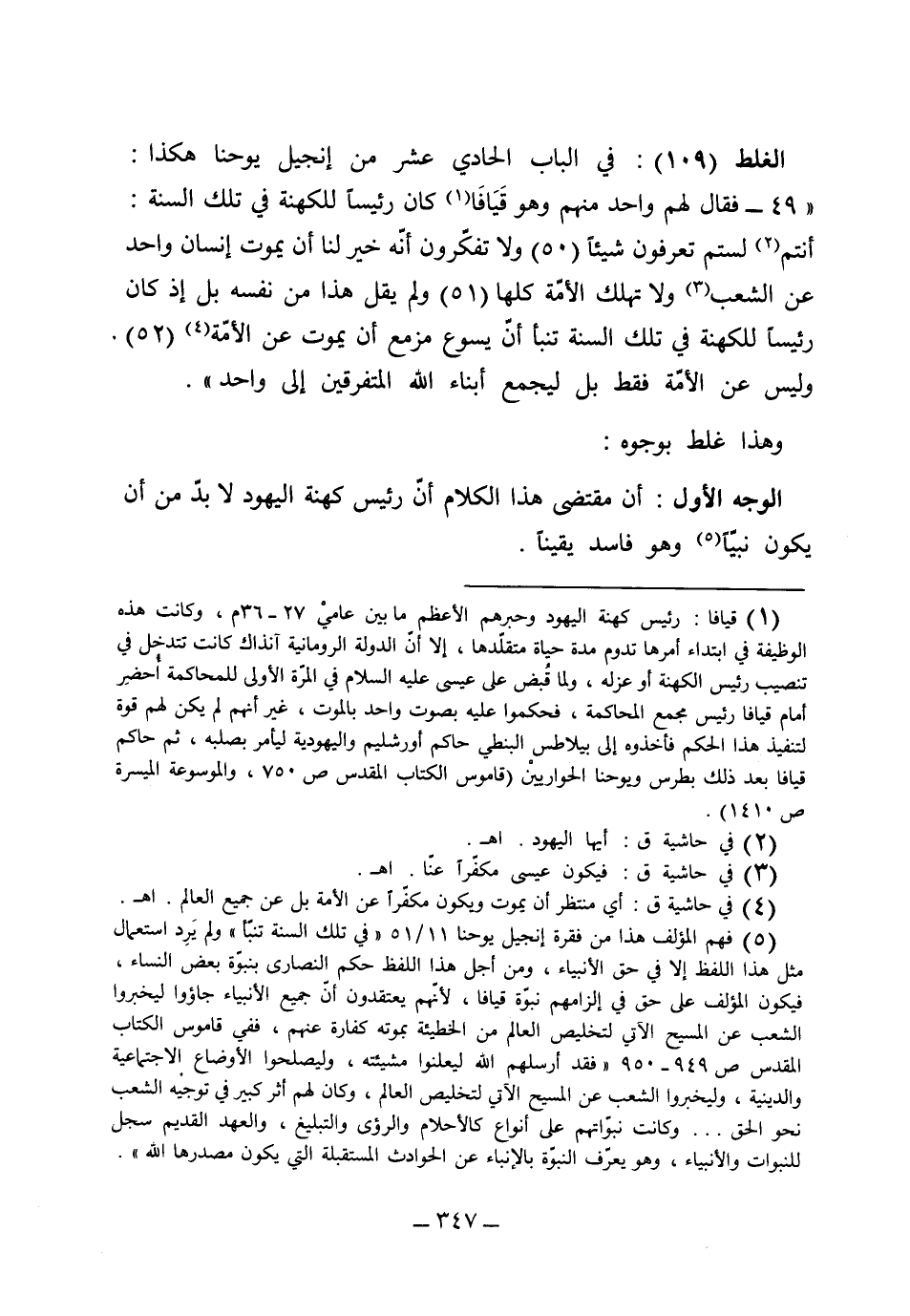 الغلط [109] في الباب الحادي عشر من إنجيل يوحنا هكذا: 49: "فقال لهم واحد منهم هو قيافا كان رئيساً للكهنة في تلك السنة: أنتم لستم تعرفون شيئاً 50 "ولا تفكرون أنه خير لنا أن يموت إنسان واحد عن الشعب ولا تهلك الأمة كلها" 51 "ولم يقل هذا من نفسه بل إذا كان رئيساً للكهنة في تلك السنة تنبأ أن يسوع منتظر أن يموت عن الأمة" 52 "وليس عن الأمة فقط بل ليجمع أبناء الله المتفرقين إلى واحد" وهذا غلط بوجوه: (الأول) أن مقتضى هذا الكلام أن رئيس كتبة اليهود لا بد من أن يكون نبياً وهو فاسد يقيناً.