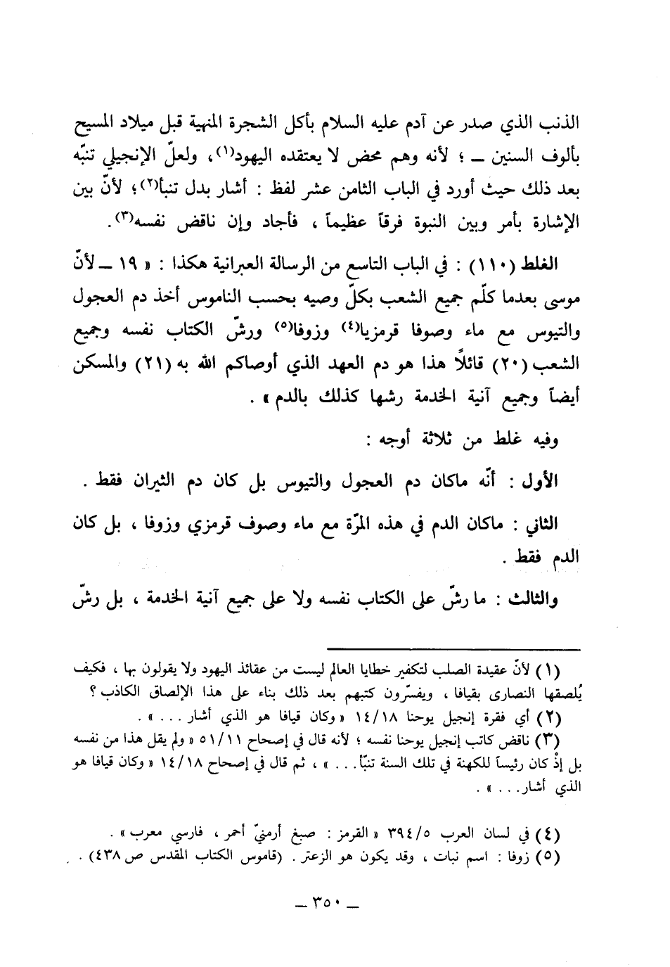 الغلط [110] في الباب التاسع من الرسالة العبرانية هكذا: 19: "لأن موسى بعد ما كلم جميع الشعب بكل وصية بحسب الناموس أخذ دم العجول والتيوس مع ماء وصوفاً قرمز ياوز وفاورَشَّ الكتاب نفسه وجميع الشعب" 30 "قائلاً هذا هو دم العهد الذي أوصاكم الله به" 21 "والمسكن أيضاً وجميع آنية الخدمة رشها كذلك بالدم" وفيه غلط من ثلاثة أوجه: (الأول) أنه ما كان دم العجول والتيوس بل كان دم الثيران فقط. (الثاني) ما كان الدم في هذه المرة مع ماء وصوف قرمزي وزوفابل كان الدم فقط.