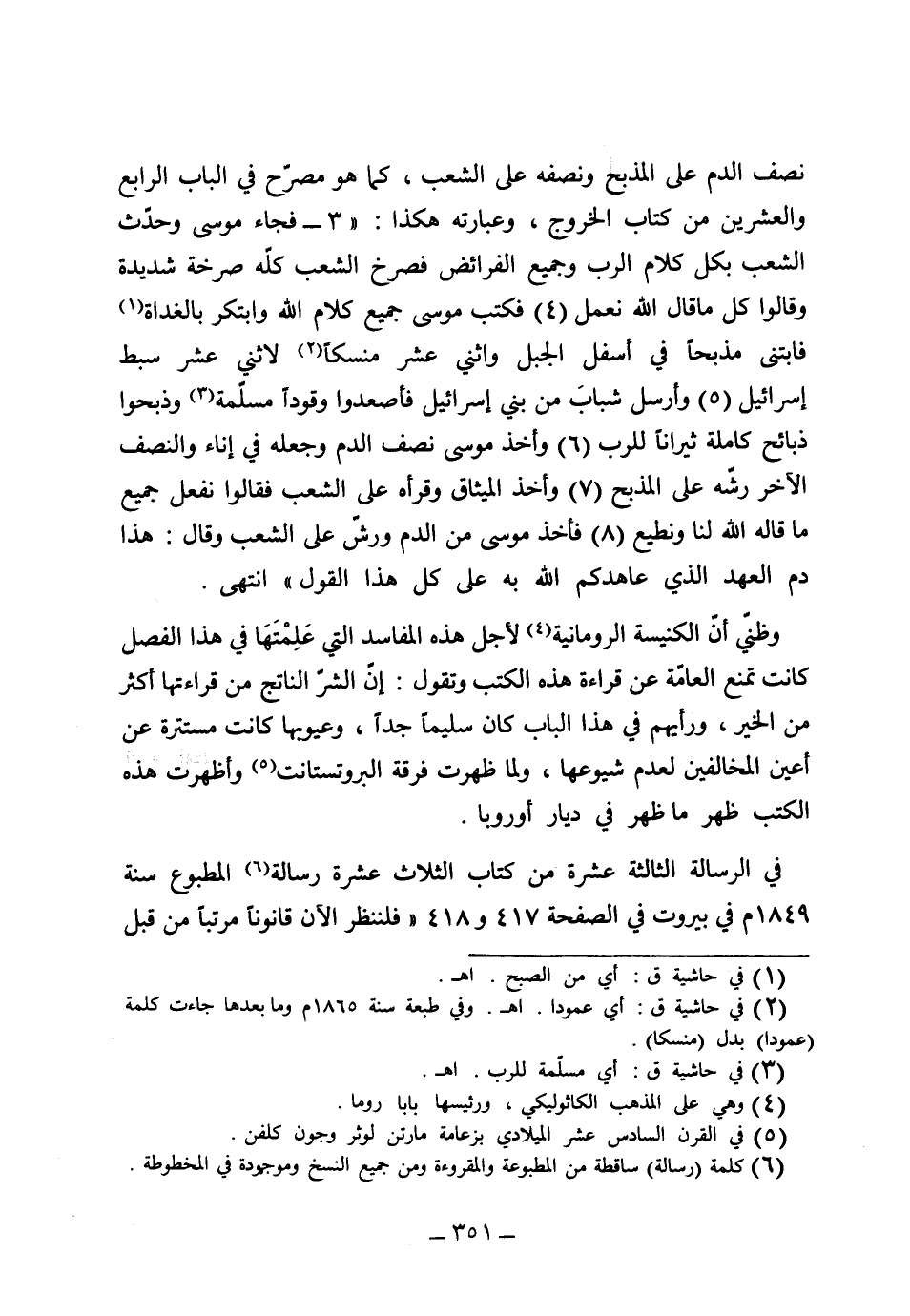 نصف الدم على المذبح ونصفه على الشعب، كما هو مصرح في الباب الرابع والعشرين من كتاب الخروج وعبارته هكذا: 3 (فجاء موسى وحدت الشعب بكل كلام الرب وجميع الفرائض فصرخ الشعب كله صرخة شديدة، وقالوا كل ما قال الله نعمل) 4 (فكتب موسى جميع كلام الله وابتكر بالغداة فابتنى مذبحاً في أسفل الجبل واثني عشر منسكاً لاثني عشر سبط إسرائيل) 5 (وأرسل شباب بني إسرائيل فاصعدوا وقوداً مسلمة وذبحوا ذبائح كاملة ثيراناً للرب) 6 (وأخذ موسى نصف الدم وجعله في إناء والنصف الآخر رشه على المذبح) 7 (وأخذ الميثاق وقرأه على الشعب فقالوا نفعل جميع ما قاله الله لنا ونطيع) 8 (فأخذ موسى الدم ورش على الشعب وقال هذا العهد الذي عاهدكم الله به على كل هذا القول) ، وظني أن الكنيسة الرومانية لأجل هذه المفاسد التي علمتها في هذا الفصل كانت تمنع العامة عن قراءة هذه الكتب، وتقول إن الشر الناتج من قراءتها أكثر من الخير، ورأيهم في هذا الباب كان سليماً جداً، وعيوبها كانت مستترة عن أعين المخالفين لعدم شيوعها، ولما ظهرت فرقة البروتستنت وأظهرت هذه الكتب ظهر ما ظهر في ديار أوروبا في الرسالة الثالثة عشرة من كتاب الثلاث عشرة المطبوعة سنة 1849 في بيروت في الصفحة 417 و 418 "فلننظر الآن قانوناً مرتباً من قبل