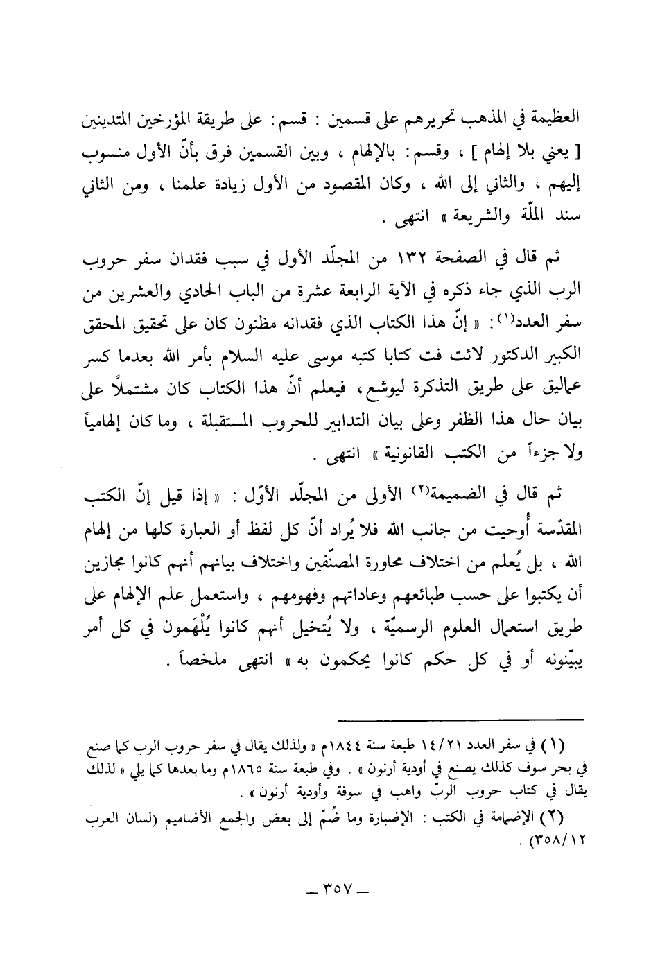 العظيمة في المذهب تحريرهم على قسمين، قسم على طريقة المؤرخين المتدينين يعني بلا إلهام، وقسم بالإلهام، وبين القسمين فَرْق بأن الأول منسوب إليهم، والثاني إلى الله، وكان المقصود من الأول زيادة علمنا، ومن الثاني سَنَدَ الملة والشريعة، ثم قال في الصفحة 133 من المجلد الأول في سبب فقدان سِفر حروف الرب الذي جاء ذكرُه في الآية الرابعة عشرة من الباب الحادي والعشرين من سفر العدد: "إن هذا الكتاب الذي فُقِد، أنه مظنون كان على تحقيق المحقق الكبير (داكتر لائت فت) كتاباً كتبه موسى عليه السلام بأمر الله بعد ما كسر عماليق على طريق التذكرة ليوشع، فيعلم أن هذا الكتاب كان مشتملاً على بيان حال هذا الظفر، وعلى بيان التدابير للحروب المستقبلة، وما كان إلهامياً ولا جزءاً من الكتب القانونية" ثم قال في الضميمة الأولى من المجلد الأول: "إذا قيل إن الكتب المقدسة أُوحيت من جانب الله فلا يراد أن كل لفظ، والعبارة كلُها من إلهام الله، بل يُعلم من اختلاف محاورة المصنفين واختلاف بيانهم أنهم كانوا مجازين أن يكتبوا على حسب طبائعهم وعاداتهم وفهومهم، واستعمل علم الإلهام على طريق استعمال العلوم