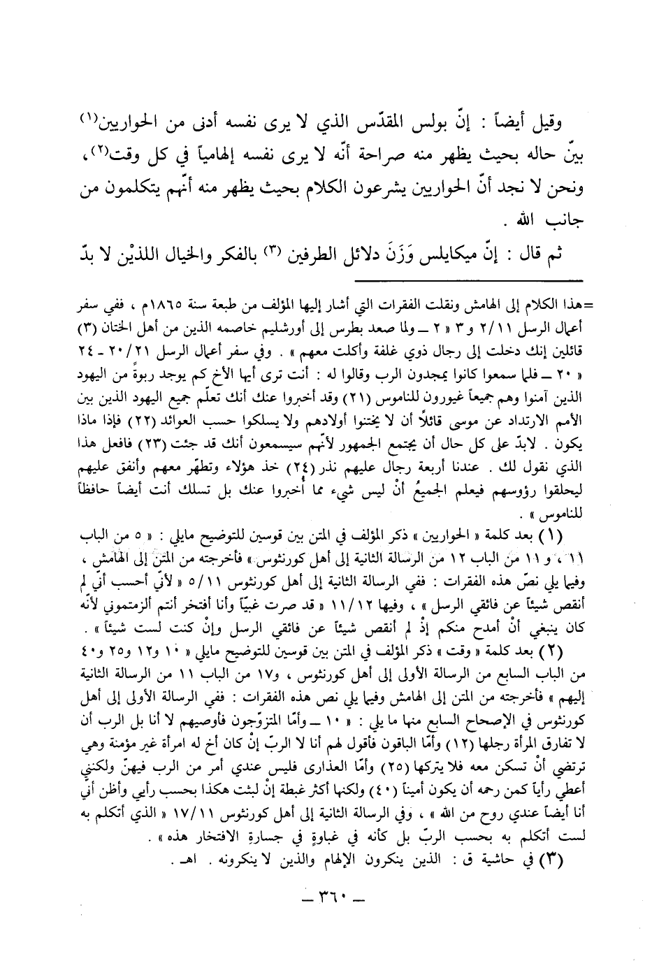 (2 و 3 من الباب الحادي عشر و 20 و 21 و 22 و 23 و 24 من الباب الحادي والعشرين من كتاب الأعمال) وقيل أيضاً: إن بولس المقدس الذي لا يرى نفسه أدنى من الحواريين (5 من الباب 11 و 11 من الباب 12 من الرسالة الثانية إلى أهل قورنيثوس) بين حاله بحيث يظهر منه صراحة أنه لا يرى نفسه إلهامياً في كل وقت (10 و 12 و 15 و 40 من الباب السابع من الرسالة الأولى إلى أهل قورنيثوس و 17 من الباب 11 من الرسالة الثانية إليهم) ونحن لا نجد أن الحواريين يشرِّعون الكلامَ بحيث يظهر منه أنهم يتكلمون من جانب الله، ثم قال إن ميكايلس وَزَنَ دلائل الطرفين بالفكر والخيال اللذين لا بد