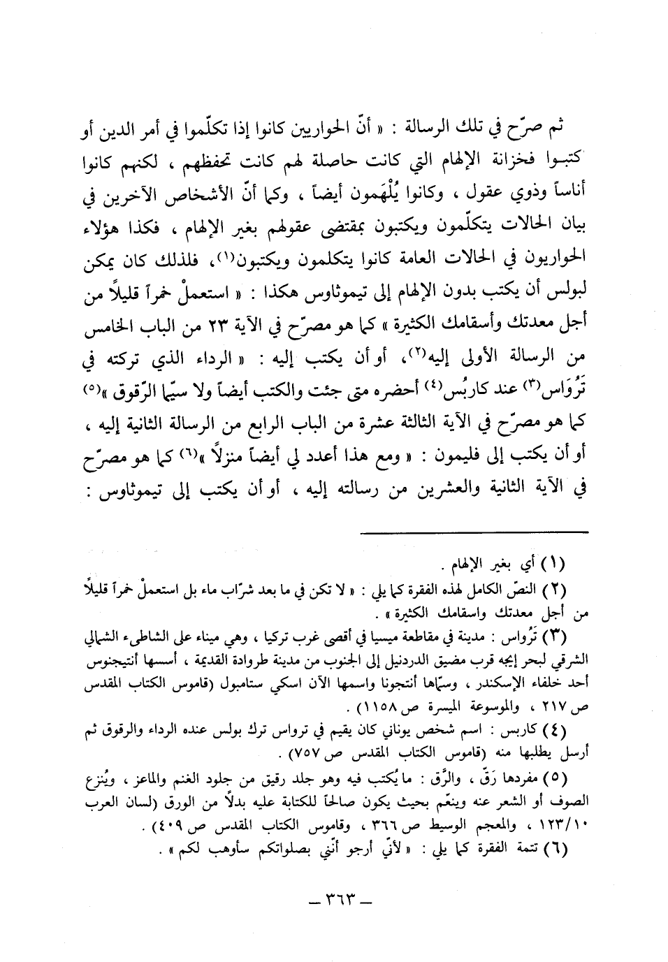 ثم صرح في تلك الرسالة أن الحواريين كانوا إذا تكلموا في أمر الدين أو كتبوا فخزانة الإلهام التي كانت حاصلة لهم كانت تحفظهم، لكنهم كانوا أناساً وذوي عقول، وكانوا يُلْهمون أيضاً، وكما أن الأشخاص الآخرين في بيان الحالات يتكلمون ويكتبون بمقتضى عقولهم بغير الإلهام، فكذا هؤلاء الحواريون في الحالات العامة كانوا يتكلمون ويكتبون، فلذلك كان يمكن لبولس أن يكتب بدون الإلهام إلى طيموثاوس: "هكذا استعمل خمراً قليلاً من أجل معدتك وأسقامك الكثيرة" كما هو مصرح في الآية 23 من الباب الخامس من الرسالة الأولى إليه، أو أن يكتب إليه "الرداء الذي تركته في ترواس عند كاربس أحضره متى جئت والكتب أيضاً ولا سيما الرّقوق" كما هو مصرح في الآية الثالثة عشرة من الباب الرابع من الرسالة الثانية إليه، أو أن يكتب إلى فيلمون: "ومع هذا أعدد لي أيضاً منزلاً" كما هو مصرح في الآية الثانية والعشرين من رسالته إليه، أو أن يكتب إلى طيموثاوس.