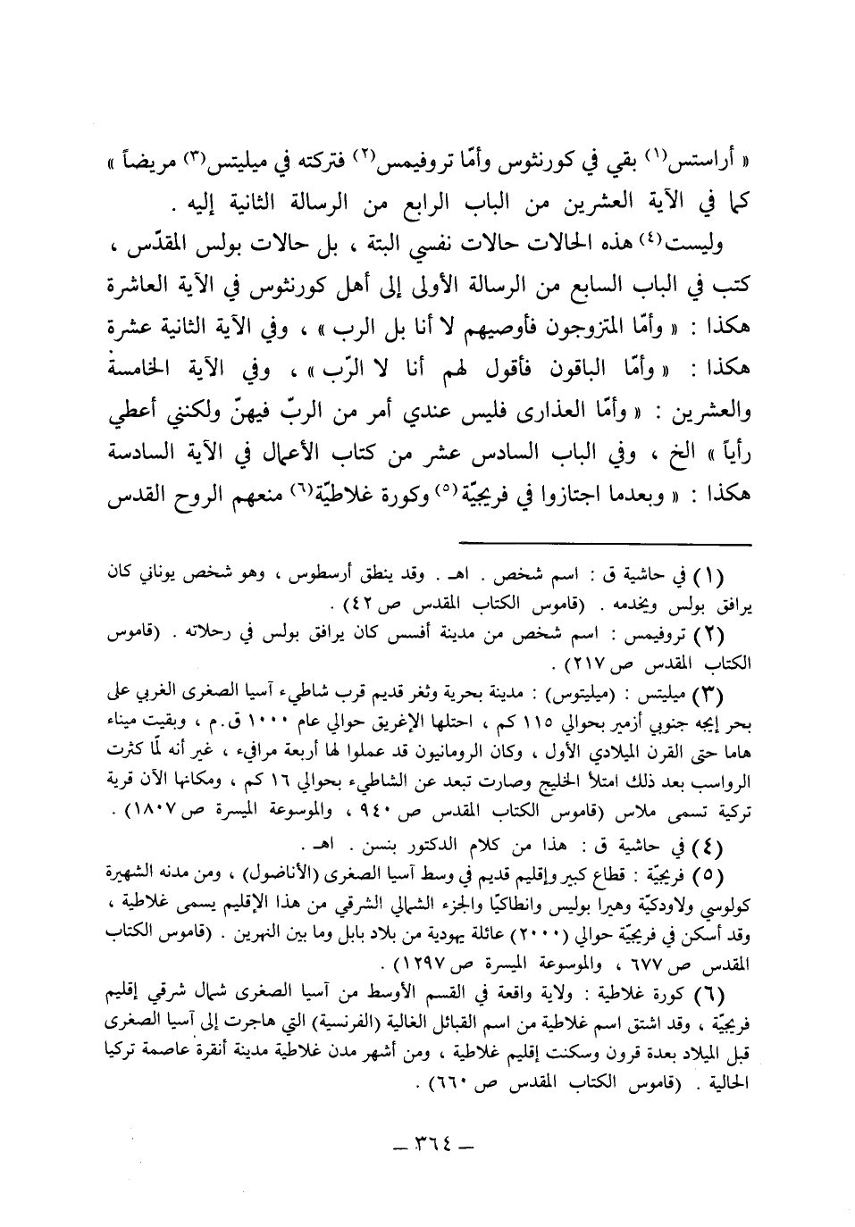 فتركته في ميليتس مريضاً" كما في الآية العشرين من الباب الرابع من الرسالة الثانية إليه، وليست هذه الحالات حالات نفسي ألبتة بل حالات بولس المقدس. كتب في الباب السابع من الرسالة الأولى إلى أهل قورنيثوس في الآية العاشرة هكذا: "فأما المتزوجون فأوصيهم لا أنا بل الرب" وفي الآية الثانية عشرة هكذا: "وأما الباقون فأنا أقول لا الرب" وفي الآية الخامسة والعشرين "وأما العذارى فليس عندي أمر من الرب فيهن ولكنني أعطي رأياً" ... الخ، وفي الباب السادس عشر من كتاب الأعمال في الآية السادسة هكذا: "وبعد ما اجتازوا في فريجية وكورة غلاطية منعهم الروح القدس