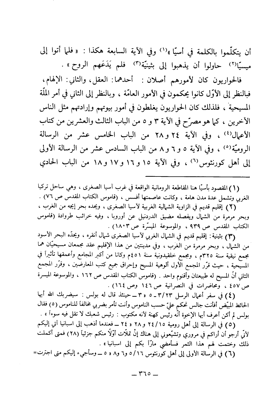 أن يتكلموا بالكلمة في آسيا، وفي الآية السابعة هكذا: "فلما أتوا إلى ميسيا حاولوا أن يذهبوا إلى ابثيتنية فلم يدعهم الروح" فالحواريون كان لأمورهم أصلان: أحدهما العقل، والثاني الإلهام، فبالنظر إلى الأول كانوا يحكمون في الأمور العامة، وبالنظر إلى الثاني في أمر الملة المسيحية، فلذلك كان الحواريون يغلطون في أمور بيوتهم وإرادتهم مثل الناس الآخرين كما هو مصرح في الآية 3 و 5 من الباب الثالث والعشرين من كتاب الأعمال، وفي الآية 24 و 28 من الباب الخامس عشر من الرسالة الرومية، وفي الآية 5 و 6 و 8 من الباب السادس عشر من الرسالة الأولى إلى أهل قورنيثوس وفي الآية 15 و 16 و 17 و 18 من الباب الحادي