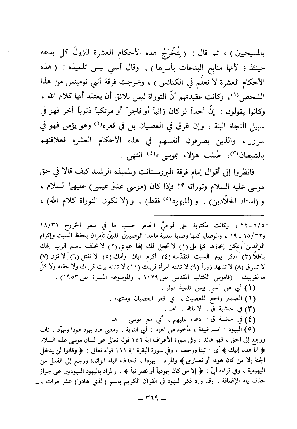 يصرفون أنفسهم في هذه الأحكام العشرة فعلاقتهم بالشيطان، صُلِب هؤلاء بموسى" فانظروا إلى أقوال إمام فرقة البروتستنت وتلميذه الرشيد كيف قالا في حق موسى عليه السلام وتوراته، فإذا كان موسى عدو عيسى عليهما السلام وأستاذ الجلادين، ولليهود فقط ولا يكون التوراة كلام الله،