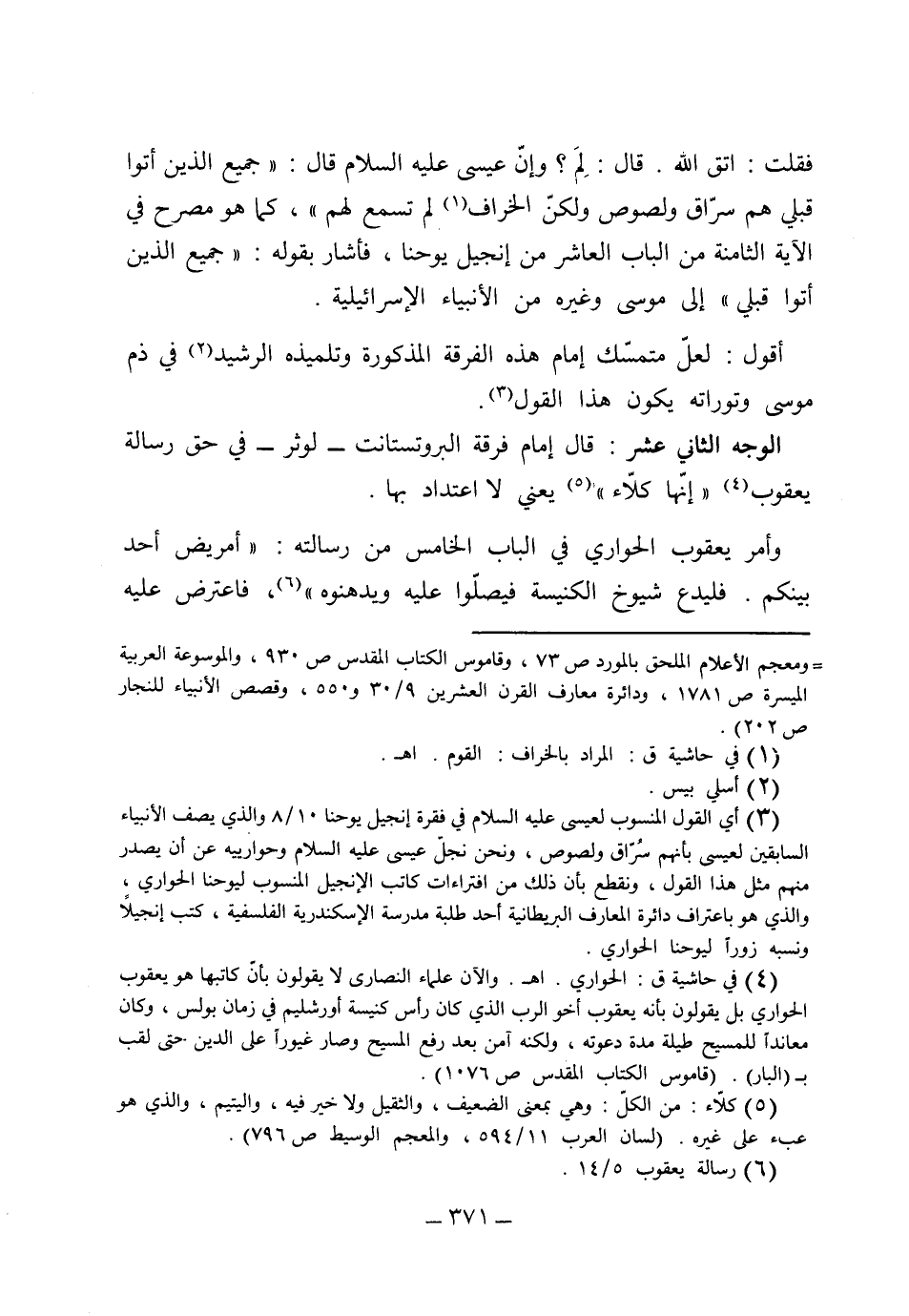 فقلت اتق الله، قال لِمَ؟ وأن عيسى عليه السلام قال: "جميع الذين أتوا قبلي هم سُراق ولصوص، ولكن الخراف لم تسمع لهم" كما هو مصرح في الآية الثامنة من الباب العاشر من إنجيل يوحنا، فأشار بقوله جميع الذين أتوا قبلي إلى موسى وغيره من الأنبياء الإسرائيلية، (أقول) لعل متمسك إمام هذه الفرقة المذكورة وتلميذه الرشيد في ذم موسى وتوراته يكون هذا القول.