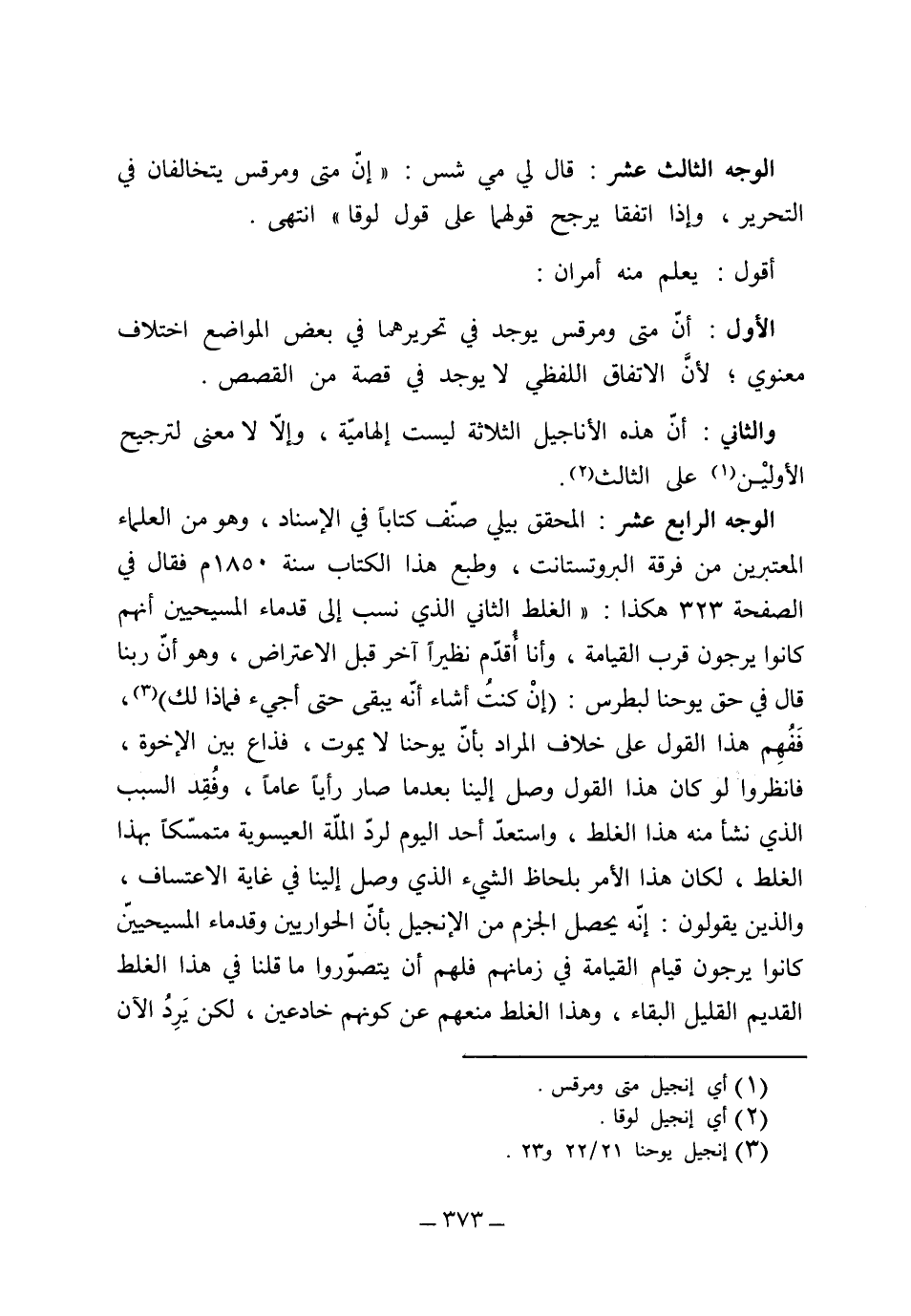 الوجه (الثالث عشر) قال كلي شيس: "إن مرقص ومتى يتخالفان في التحرير، وإذا اتفقا ترجح قولهما على قول لوقا" أقول: يعلم منه أمران: (الأول) أن متى ومرقس يوجد في تحريرهما في بعض المواضع اختلاف معنوي، لأن الاتفاق اللفظي لا يوجد في قصة من القصص (والثاني) أن هذه الأناجيل الثلاثة ليست إلهامية وإلا لا معنى لترجيح الأولين على الثالث.