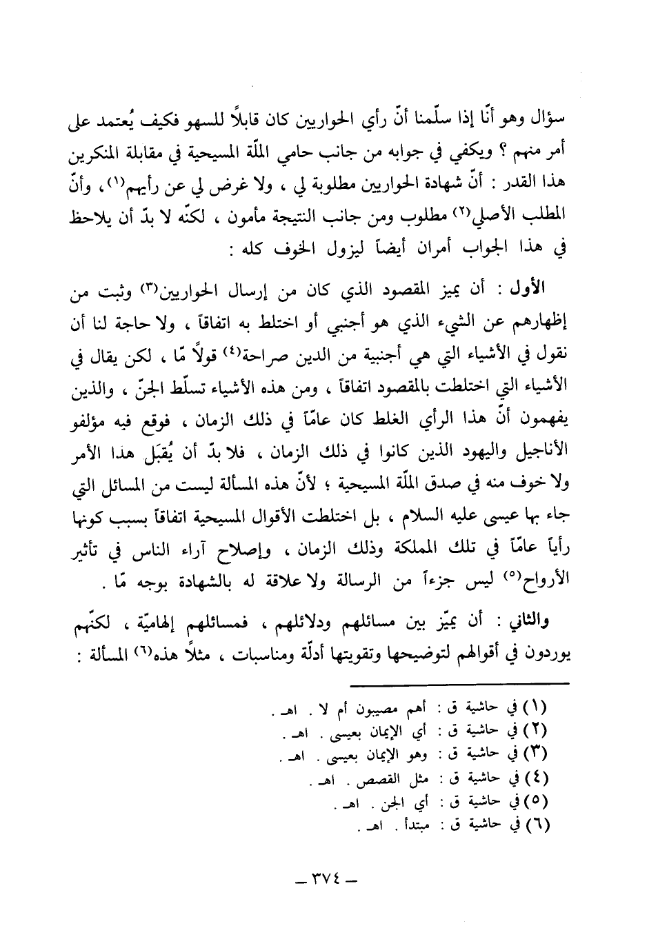 سؤال وهو إنا إذا سلمنا أن رأي الحواريين كان قابلاً للسهو فكيف يعتمد على أمر منهم؟ ويكفي في جوابه من جانب حامي الملة المسيحية في مقابلة المنكرين هذا القدر أن شهادة الحواريين مطلوبة لي، ولا غرض لي عن رأيهم، وأن المطلب الأصلي مطلوب، ومن جانب النتيجة مأمون، لكنه لا بد أن يُلاحظ في هذا الجواب أمران أيضاً ليزول الخوف كله (الأول) أن يُميز المقصود الذي كان من إرسال الحواريين، وثبت من إظهارهم عن الشيء الذي هو أجنبي أو اختلط به اتفاقاً، ولا حاجة لنا أن نقول في الأشياء التي هي أجنبية من الدين صراحة، لكن يقال في الأشياء التي اختلطت بالمقصود اتفاقاً قولاً ما، ومن هذه الأشياء تسلط الجن، والذين يفهمون أن هذا الرأي الغلط كان عاماً في ذلك الزمان، فوقع مؤلفو الأناجيل واليهود الذين كانوا في
