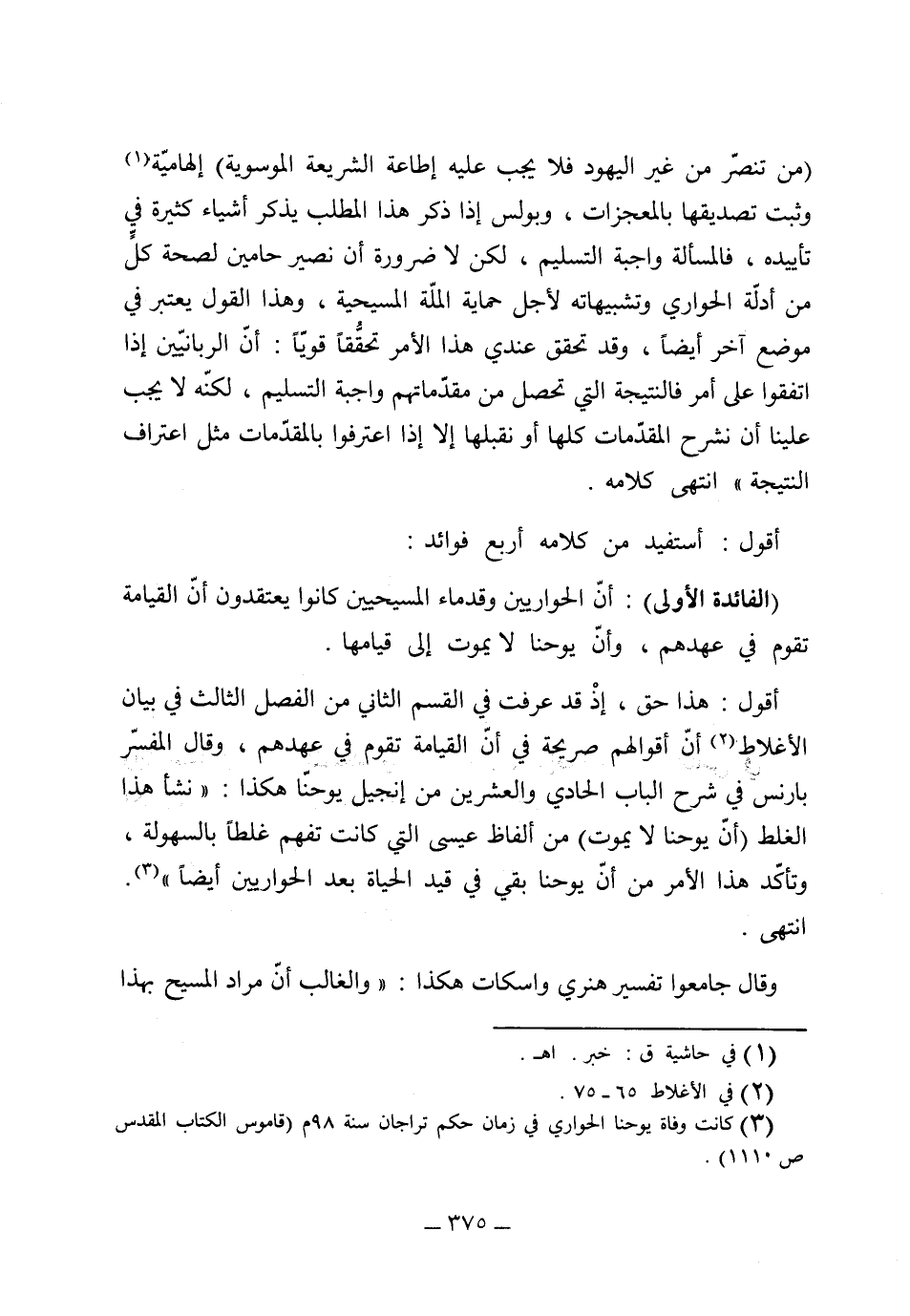 أقول: أستفيد من كلامه أربع فوائد: (الأولى) أن الحواريين والقدماء المسيحية كانوا يعتقدون أن القيامة تقوم في عهدهم، وأن يوحنا لا يموت إلى قيامها. أقول هذا حق، إذ قد عرفت في القسم الثاني من الفصل الثالث في بيان الأغلاط أن أقوالهم صريحة في أن القيامة تقوم في عهدهم، وقال المفسر يارنس في شرح الباب الحادي والعشرين من إنجيل يوحنا هكذا: "نشأ هذا الغلط أن يوحنا لا يموت من ألفاظ عيسى التي كانت تفهم غلطاً بالسهولة، وتأكد هذا الأمر من [أن] يوحنا بقي في قيد الحياة بعد الحواريين أيضاً"، وقال جامعو تفسير هنري واسكات هكذا: "والغالب أن مراد المسيح بهذا