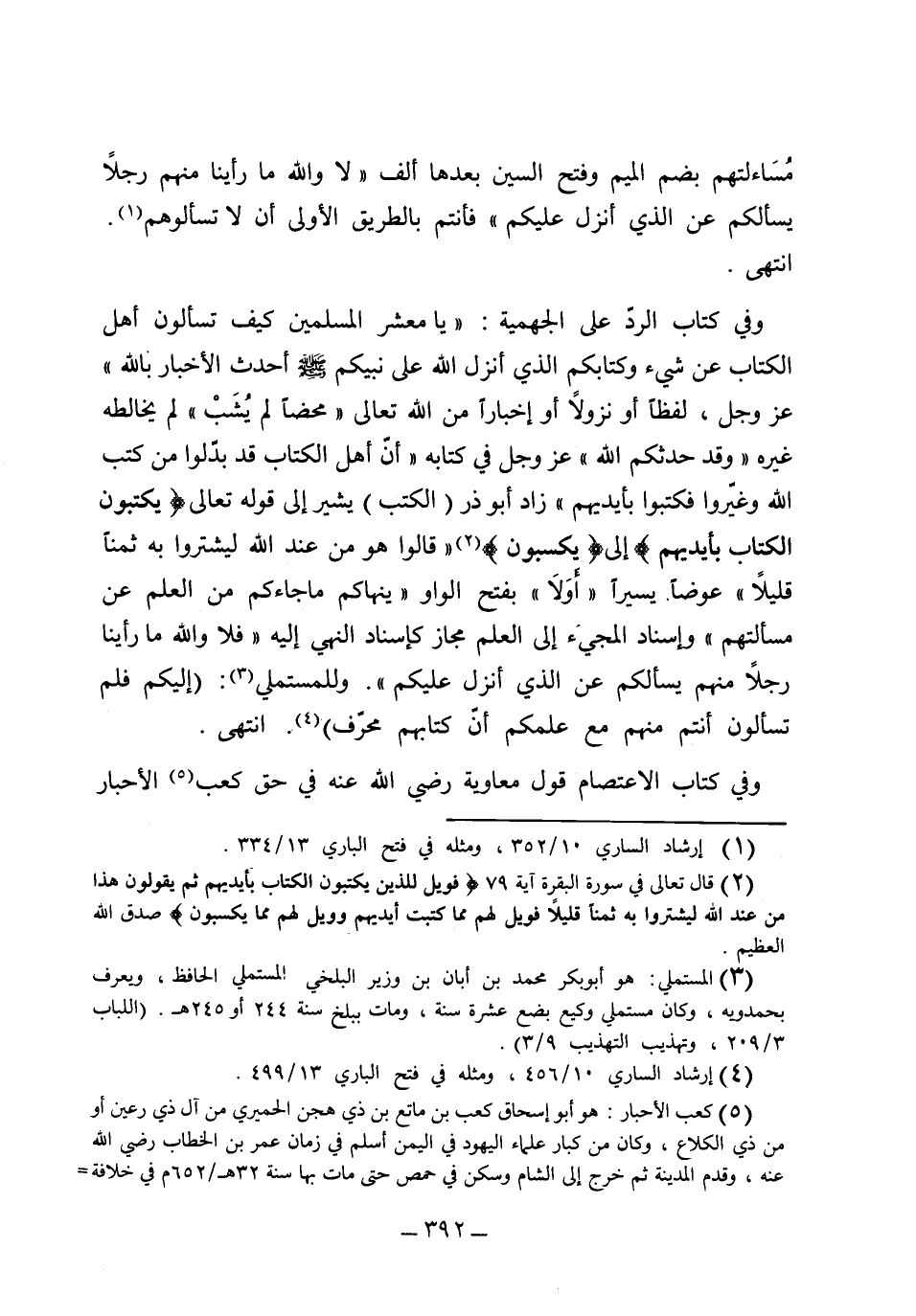 ْوفي كتاب الرد على الجهمية "يا معشر المسلمين كيف تسألون أهل الكتاب عن شيء وكتابكم الذي أنزله الله على نبيكم صلى الله عليه وسلم أحدث الأخبار بالله" عز وجل لفظاً أو نزولاً أو إخباراً من الله تعالى "محضاً لم يشب" لم يخالطه غيره "قد حدثكم الله عز وجل في كتابه أن أهل الكتاب قد بدلوا من كتب الله وغيروا فكتبوا بأيديهم" زاد أبو ذر الكتب، يشير إلى قوله تعالى يكتبون بأيديهم إلى يكسبون {قَالُوا هُوَ مِنْ عِنْد الله لِيَشْتروا بِهِ ثَمناً قلِيلاً} عوضاً يسيراً "أو لا" بفتح الواو "ينهاكم ما جاءكم من العلم عن مسألتهم" وإسناد المجيء إلى العلم مجاز كإسناد النهي إليه "فلا والله ما رأينا رجلاً يسألكم عن الذي أُنزل عليكم" وللمستملي إليكم فلم تسألون أنتم منهم مع علمكم أن كتابهم محرف.