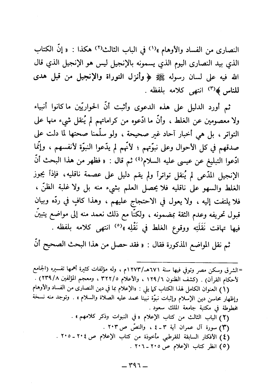 النصارى من الفساد والأوهام في الباب الثالث هكذا: "إن الكتاب الذي بيد النصارى الذي يسمونه بالإنجيل ليس هو الإنجيل الذي قال الله فيه على لسان رسوله صلى الله عليه وسلم وأنزل التَّوْراة والإنْجيلَ مِنْ قَبْل هُدىً للِنَّاسِ" انتهى كلامه بلفظه. ثم أورد الدليل على هذه الدعوى، وأثبت أن الحواريين ما كانوا أنبياء ولا معصومين عن الغلط، وأن ما ادعوا من كراماتهم لم ينقل شيء منها على التواتر بل هي أخبار آحاد غير صحيحة، ولو سلمنا صحتها لما دلت على صدقهم في كل الأحوال، وعلى نبوتهم لأنهم لم يدّعوا النبوة لأنفسهم، وإنما ادعوا التبليغ عن عيسى عليه السلام ثم قال: "فظهر من هذا البحث أن الإنجيل المدّعى لم يُنقل تواتراً ولم يقم دليلٌ على عصمة ناقليه فإذاً يجوز الغلط والسهو على ناقليه، فلا يحصل العلم بشيء منه ولا غلبة الظن فلا يُلْتفتُ إليه ولا يُعَوَّل في الاحتجاج عليه، وهذا كاف في رده وبيان قبول تحريفه، وعدم الثقة بمضمونه، ولكنا مع ذلك نعمد منه إلى مواضع يتبين فيها تهافت نَقَلَته ووقوع الغلط في نقله" انتهى كلامه بلفظه. ثم نقل المواضع المذكورة فقال: "فقد حصل من هذا البحث الصحيح أن