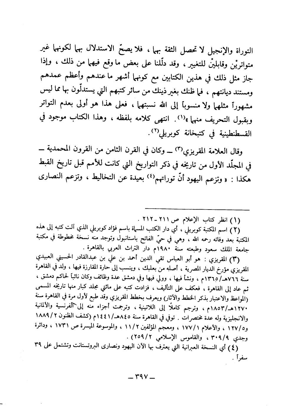 التوراة والإنجيل لا يحصل الثقة بهما فلا يصح الاستدلال بهما لكونهما غير متواترين وقابلين للتغير، وقد دللنا على بعض ما وقع فيهما من ذلك، وإذا جاز مثل ذلك في هذين الكتابين مع كونهما أشهر ما عندهم وأعظم عُمُدهم ومستَنَد ديانتهم فما ظنك بغير ذينك من سائر كتبهم التي يستدلون بها، مما ليس مشهوراً مثلهما ولا منسوباً إلى الله نسبتهما، فعلى هذا هو أولى بعدم التواتر وبقبول التحريف منهما" انتهى كلامه بلفظه، وهذا الكتاب موجود في القسطنطينية في كتبخانة كوبرلي.