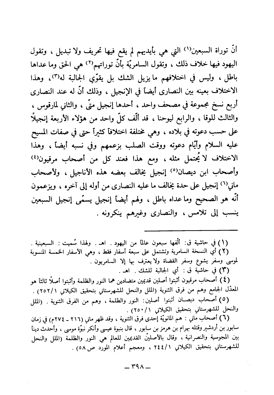 أو توراة السبعين التي هي بأيديهم لم يقع فيها تحريف ولا تبديل، وتقول اليهود فيه خلاف ذلك وتقول السامرية بأن توراتهم هي الحق وما عداها باطل، وليس في اختلافهم ما يزيل الشك، بل يقوي الجالبة له، وهذا الاختلاف بعينه بين النصارى أيضاً في الإنجيل، وذلك أن له عند النصارى أربعَ نسخ مجموعة في مصحف واحد، أحدها لإنجيل متى، والثاني لمارقوس، والثالث للوقا والرابع ليوحنا، قد ألّفه كل من هؤلاء الأربعة إنجيلاً على حسب دعوته في بلاده، وهي مختلفة اختلافاً كثيراً حتى في صفات المسيح عليه السلام وأيام دعوته، ووقت الصلب بزعمهم وفي نسبه أيضاً، وهذا الاختلاف لا يحتمل مثله، ومع هذا فعند كل من أصحاب مَرْقيون وأصحاب ابن ويصان إنجيل يخالف بعضُه هذه الأناجيل، ولأصحاب ماني إنجيل على حدة يخالف ما عليه النصارى من أوله إلى آخره، ويزعمون أنه الصحيح، وما عداه باطل، ولهم أيضاً إنجيل يسمى إنجيل السبعين ينسب إلى تلامس، والنصارى وغيرهم ينكرونه،.