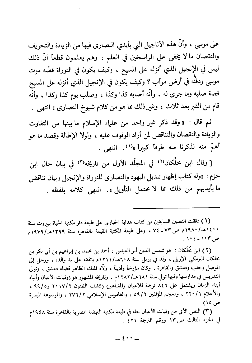 [وقال ابن خلِّكان في المجلّد الأول من تاريخه في بيان حال ابن حزم: "وله كتاب إظهار تبديل اليهود والنصارى للتوراة والإنجيل وبيان تناقض ما بأيديهم من ذلك مما لا يحتمل التأويل ". انتهى كلامه بلفظه.