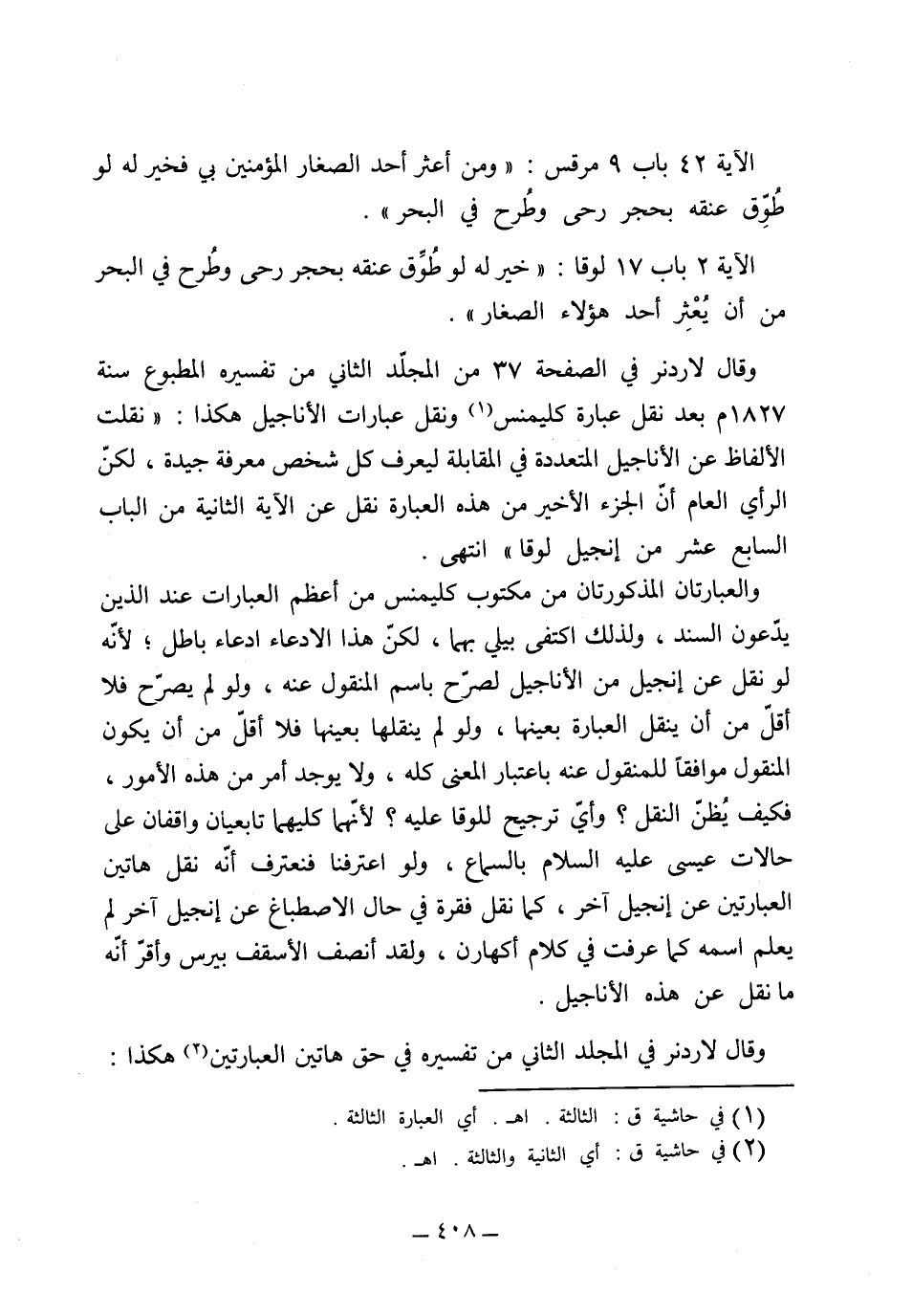 42 باب 9 مرقس "ومن أعثر أحد الصغار المؤمنين بي فخير له لو طوق عنقه بحجر رحى وطرح في البحر" الآية 2 باب 17 لوقا "خيراً له لو طوق عنقه بحجر رحى وطرح في البحر من أن يعثر أحد هؤلاء الصغار" وقال لاردنر في الصفحة 37 من المجلد الثاني من تفسيره المطبوع سنة 1827 بعد نقل عبارة كليمنس ونقل عبارات الأناجيل هكذا: "نقلت الألفاظ عن الأناجيل المتعددة في المقابلة ليعرف كل شخص معرفة جيدة، لكن الرأي العام أن الجزء الأخير من هذه العبارة نقل عن الآية الثانية من الباب السابع عشر من إنجيل لوقا" والعبارتان المذكورتان من مكتوب كليمنس من أعظم العبارات عند الذين يدعون السند، ولذلك اكتفى بيلي بهما، لكن هذا الادعاء ادعاء باطل، لأنه لو نقل عن إنجيل من الأناجيل لصرح باسم المنقول عنه، ولو لم يصرح فلا أقل من أن ينقل العبارة بعينها، ولو لم ينقلها بعينها فلا أقل من أن يكون المنقول موافقاً للمنقول عنه باعتبار