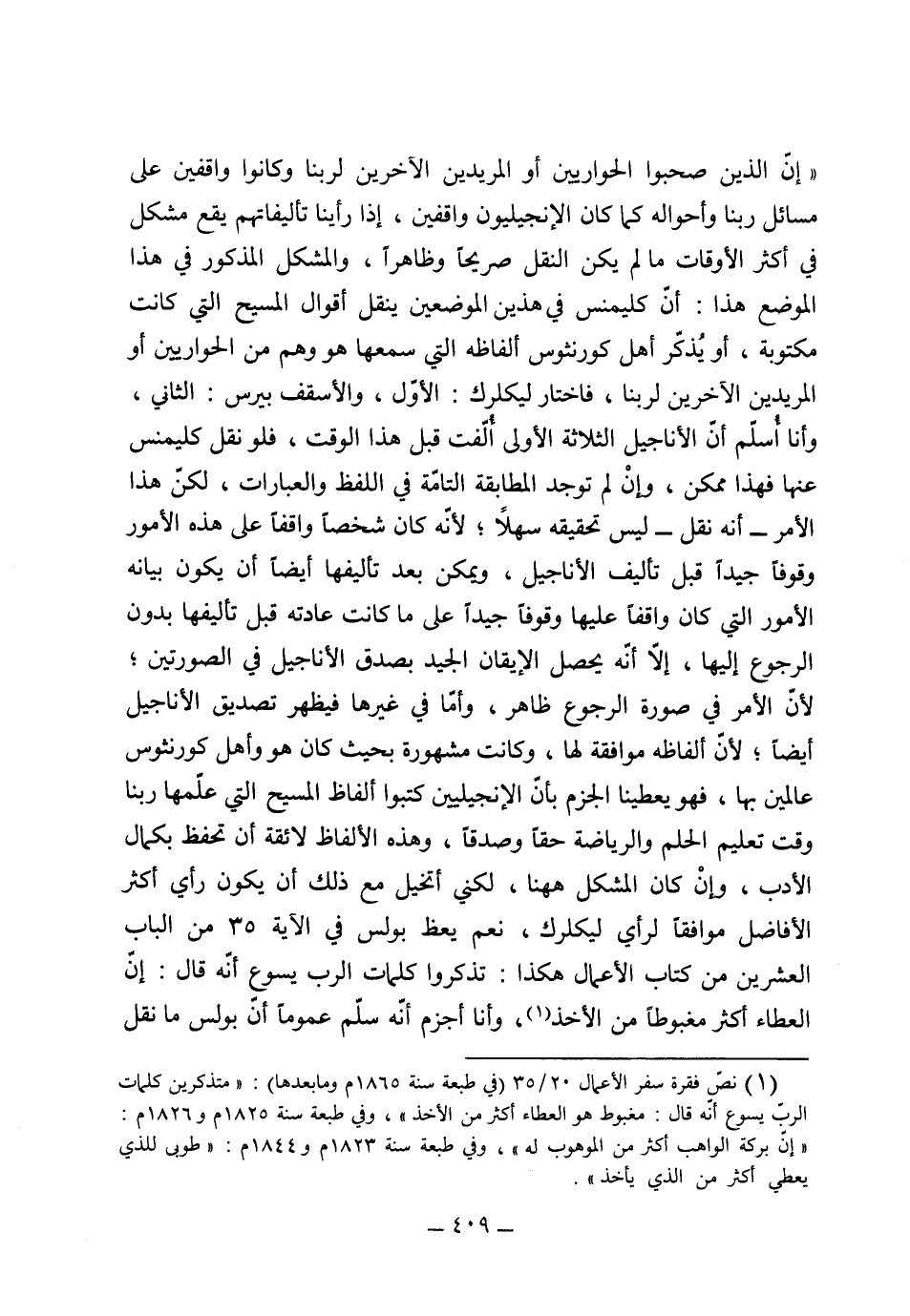 هذا أن كليمنس في هذين الموضعين ينقل أقوال المسيح التي كانت مكتوبة، أو يذكر أهل قورنيثوس ألفاظه التي سمعها هو وهم من الحواريين والمريدين الآخرين لربنا، فاختار ليكلرك الأول والأسقف بيرس الثاني، وأنا أسلم أن الأناجيل الثلاثة الأولى ألفت قبل هذا الوقت، فلو نقل كليمنس عنها فهذا ممكن، وإن لم توجد المطابقة التامة في اللفظ والعبارات، لكن هذا الأمر أنه نقل ليس تحقيقه سهلاً لأنه كان شخصاً واقفاً من هذه الأمور وقوفاً جيِّداً قبل تأليف الأناجيل، ويمكن بعد تأليفها أيضاً أن يكون بيانه الأمور التي كان واقفاً عليها وقوفاً جيداً على ما كان عادته قبل تأليفها بدون الرجوع إليها، إلا أنه يحصل الإيقان الجيد بصدق الأناجيل في الصورتين، لأن الأمر في صورة الرجوع ظاهر وأما في غيرها فيظهر تصديق الأناجيل أيضاً لأن ألفاظه موافقة لها، وكانت مشهورة بحيث كان هو وأهل قورنيثوس عالمين بها، فهو يعطينا الجزم بأن الإنجيليين كتبوا ألفاظ المسيح التي علمها ربنا وقت تعلم الحلم والرياضة حقاً وصدقاً، وهذه الألفاظ لائقة أن تحفظ بكمال الأدب، وإن كان المشكل ههنا، لكنني أتخيل مع ذلك أن يكون رأي أكثر الأفاضل موافقاً لرأي ليكلرك. نعم يعظ بولس في الآية 15 من الباب العشرين من كتاب الأعمال هكذا: "تذكروا كلمات الرب يسوع أنه قال إن العطاء مغبوط أكثرَ من الأخذ" وأنا أجزم أنه سلم عموماً أن بولس ما نقل