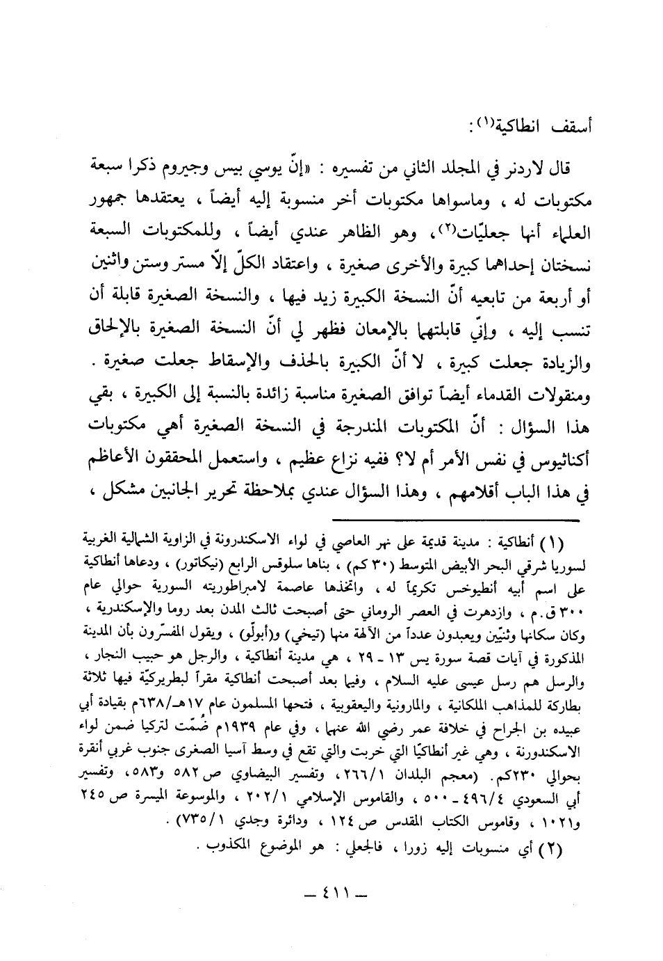 أسقف أنطاكية، قال لاردنر في المجلد الثاني من تفسيره: "إن يوسي بيس وجيروم ذكرا سبعة مكتوبات له وما سواها مكتوبات أخر منسوبة إليه يعتقدها جمهور العلماء أنها جَعْليات، وهو الظاهر عندي أيضاً، وللمكتوبات السبعة نسختان إحداهما كبيرة والأخرى صغيرة، واعتقاد الكل إلا مستر وستن واثنين أو أربعة من تابعيه أن النسخة الكبيرة زيد فيها، والنسخة الصغيرة قابلة أن تنسب إليه، وإني قابلتهما بالإمعان فظهر لي أن النسخة الصغيرة بالإلحاق والزيادة جُعلت كبيرة لا أنّ الكبيرةَ بالحذف والإسقاط جُعِلت صغيرة، ومنقولات القدماء توافق الصغيرة مناسبة زائدة بالنسبة إلى الكبيرة. بقي هذا السؤال أن المكتوبات المندرجة في النسخة الصغيرة أهي مكتوبات أكناثيوس في نفس الأمر أم لا؟ ففيه نزاع عظيم واستعمل المحققون الأعاظم في هذا الباب أقلامهم، وهذا السؤال عندي بملاحظة تحرير الجانبين مشكل،