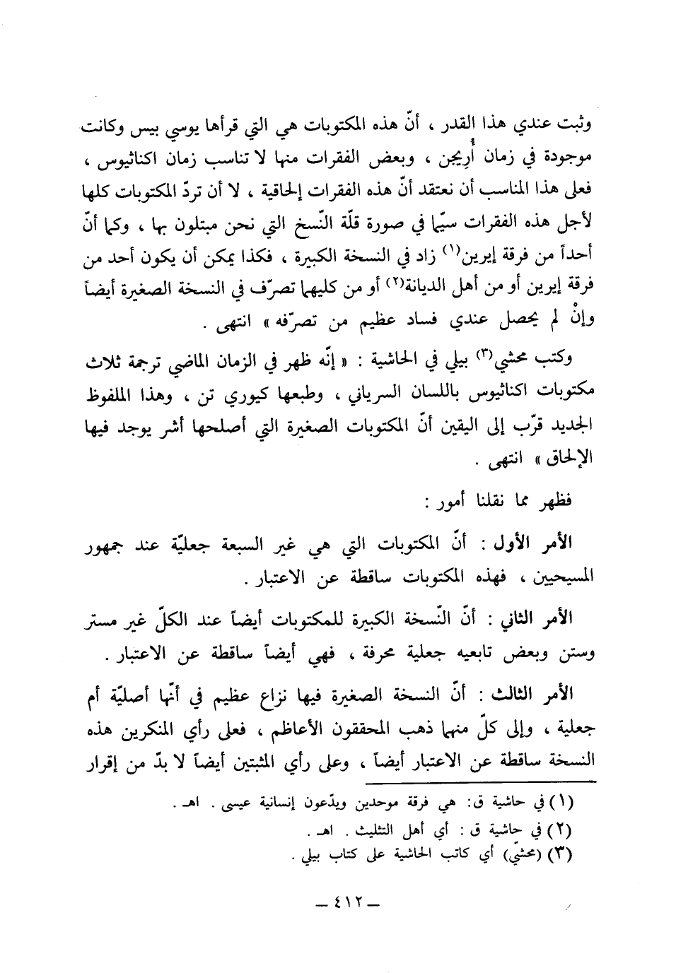 فظهر مما نقلنا أمور: (الأول) أن المكتوبات التي هي غير السبعة جعلية عند جمهور المسيحيين، فهذه المكتوبات ساقطة عن الاعتبار (الثاني) أن النسخة الكبيرة للمكتوبات أيضاً عند الكل غير مستر وسن وبعض تابعيه جعلية محرفة فهي أيضاً ساقطة عن الاعتبار (الثالث) أن النسخة الصغيرة فيها نزاع عظيم في أنها أصلية أم جعلية، وإلى كل منهما ذهب المحققون الأعاظم، فعلى رأي المنكرين هذه النسخة ساقطة عن الاعتبار أيضاً، وعلى رأي المثبتين أيضاً لا بد من إقرار