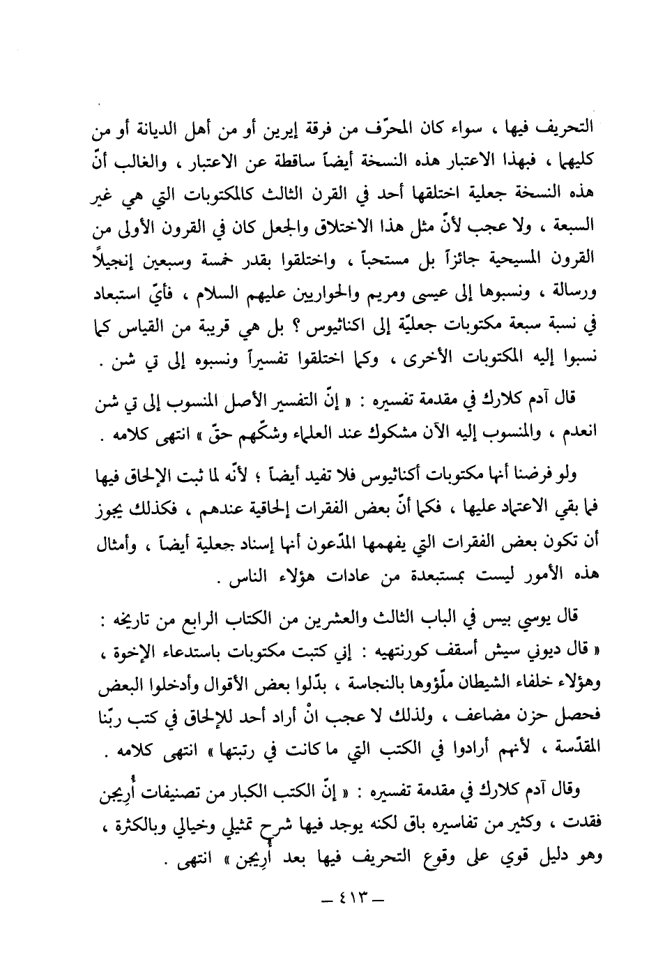 التحريف فيها سواء كان المحرف من فرقة أيرين أو من أهل الديانة أو من كليهما، فبهذا الاعتبار هذه النسخة أيضاً ساقطة عن الاعتبار، والغالب أن هذه النسخة جَعْلية اختلقها أحد في القرن الثالث كالمكتوبات التي هي غير السبعة، ولا عجب لأن مثل هذا الاختلاف والجعل كان في القرون الأولى من القرون المسيحية جائزأ بل مستحباً، واختلفوا بقدر خمسة وسبعين إنجيلاً ورسالة، ونسبوها إلى عيسى ومريم والحواريين عليهم السلام، فأي استبعاد في نسبة سبعة مكتوبات جَعْلية إلى أكناثيوس؟، بل هي قريبة من القياس، كما نسبوا إليه المكتوبات الأخرى، وكما اختلفوا تفسيراً ونسبوه إلى (تي شن) قال آدم كلارك في مقدمة تفسيره: "إن التفسير الأصلي المنسوب إلى تي شن انعدم والمنسوب إليه الآن مشكوك عند العلماء وشكهم حق" ولو فرضنا أنها مكتوبات أكناثيوس فلا تفيد أيضاً لأنه لما ثبت الإلحاق فيه فما بقي الاعتماد عليها، فكما أن بعض الفقرات إلحاقية عندهم، فكذلك يجوز أن يكون بعض الفقرات التي يفهمها المدعون أنها إسناد جَعْلية أيضاً، وأمثال هذه الأمور ليست بمستبعدة من عادات هؤلاء.