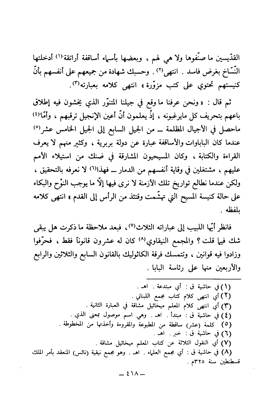 وبعضها بأسماء أساقفة أراتقة أدخلها النساخ بغرض إفسادها وحسبُك شهادةً من جميعهم على أنفسهم بأن كنيستهم تحتوي على كتب مزوّرة" انتهى كلامه بعبارته، ثم قال: "ونحن عرفنا ما وقع في جيلنا المتنور الذي يخشون فيه إطلاق باعهم بتحريف كل ما يرغبونه، إذ يعلمون أن أعين حراس الإنجيل ترقبهم وأما ما حصل في الأجيال المظلمة من الجيل السابع إلى الجيل الخامس، عندما كان الباباوات والأساقفة عبارة عن دولة بربرية، وكثير منهم لا يعرف القراءة والكتابة، وكان المسيحيون المشارقة في ضنك من استيلاء الأمم عليهم مشتغلين في وقاية أنفسهم من الدمار، فهذا لا نعرفه بالتحقيق، ولكن عندما نطالع تواريخ تلك الأزمنة لا نرى فيها إلا ما يوجب النَّوْح والبكاء على حالة كنيسة المسيح التي تهشمت وقتئذ من الرأس إلى القدم" انتهى كلامه بلفظه.