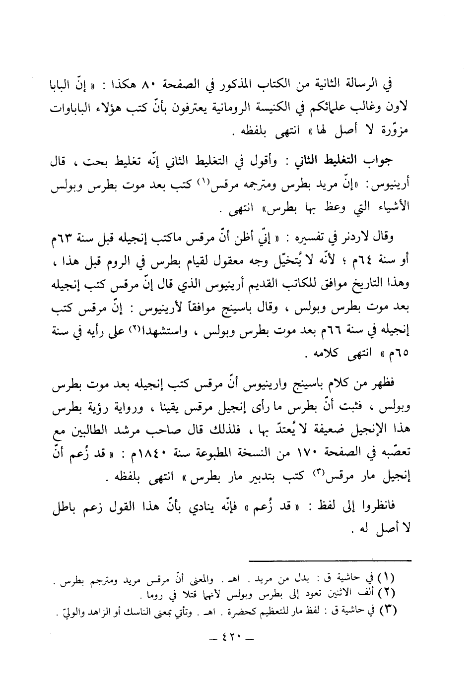 وأقول في جواب التغليط الثاني: إنه تغليط بحت "قال أرينيوس إن مريد بطرس ومترجمه مرقس كتب بعد موت بطرس وبولس الأشياء التي وعظ بها بطرس" انتهى، وقال لاردنر في تفسيره: "إني أظن أن مرقس ما كتب إنجيله قبل سنة 63 أو سنة 64 لأنه لا يُتخيل وجه معقول لقيام بطرس في الروم قبل هذا، وهذا التاريخ موافق للكاتب القديم أرينيوس، والذي قال إن مرقس كتب إنجيله بعد موت بطرس وبولس، وقال باسينج موافقاً لأرينيوس: إن مرقس كتب إنجيله في سنة 66 بعد موت بطرس وبولس واستشهدا على رأيه في سنة 95" فظهر من كلام باسينج وأرينيوس أن مرقس كتب إنجيله بعد موت بطرس وبولس، فثبت أن بطرس ما رأى أن إنجيل مرقس يقيناً، ورواية رؤية بطرس هذا الإنجيل رواية ضعيفة لا يعتد بها، فلذلك قال صاحب مرشد الطالبين مع تعصبه في الصفحة 170 من النسخة المطبوعة سنة 1840: "قد زعم أن إنجيل مار مرقس كتب بتدبير مار بطرس" انتهى بلفظه. فانظروا إلى لفظ قد زعم فإنه ينادي بأن هذا القول زعم باطل لا أصل له.