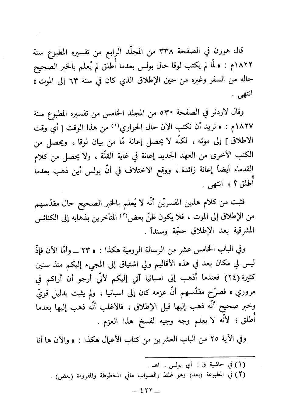 قال هورن في الصفحة 338 من المجلد الرابع من تفسيره المطبوع سنة 1822: "لما لم يكتب لوقا حال بولس بعد ما أطلق لم يعلم بالخبر الصحيح حاله من السفر وغيره من حين الإطلاق الذي كان في سنة 63 إلى الموت" وقال لاردنر في الصفحة 350 من المجلد الخامس من تفسيره المطبوع سنة 1738 "نريد أن نكتب الآن حال الحواري من هذا الوقت" أي وقت الإطلاق "إلى موته لكنه لا يحصل إعانة ما من بيان لوقا ويحصل من الكتب الأخرى من العهد الجديد إعانة في غاية القلة، ولا يحصل من كلام القدماء أيضاً إعانة زائدة، ووقع الاختلاف في أن بولس أين ذهب بعد ما أطلق" فثبت من كلام هذين المفسرين أنه لا يعلم بالخبر الصحيح حال مقدسهم من إطلاقه إلى الموت، فلا يكون ظن بعض المتأخرين بذهابه إلى الكنائس المشرقية بعد الإطلاق حجة وسند.