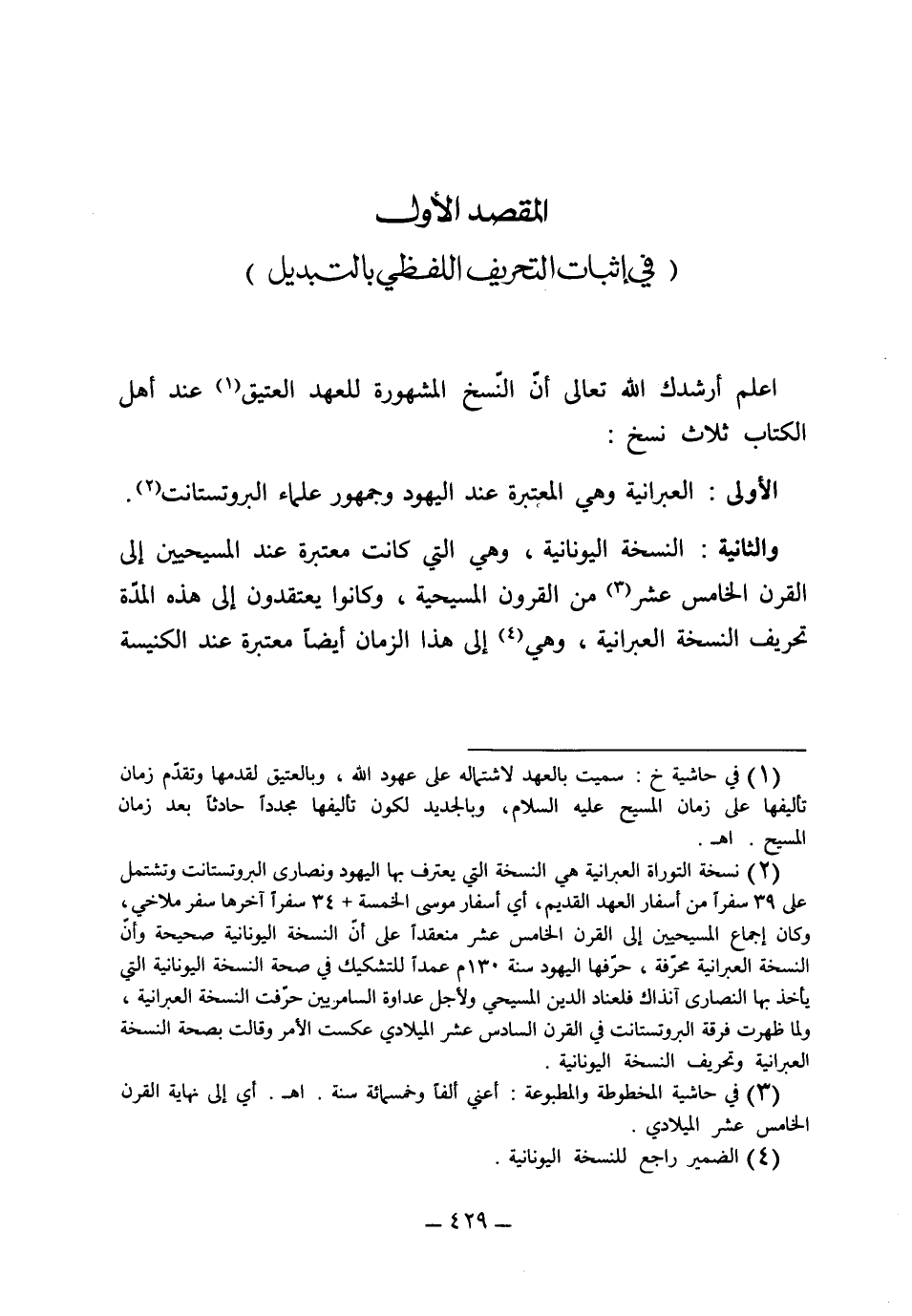 اعلم أرشدك الله تعالى أن النسخ المشهورة للعهد العتيق عند أهل الكتاب ثلاث نسخ (الأولى) العبرانية وهي المعتبرة عند اليهود، وجمهور علماء البروتستنت (والثانية) النسخة اليونانية، وهي التي كانت معتبرة عن المسيحيين إلى القرن الخامس عشر من القرون المسيحية، وكانوا يعتقدون إلى هذه المدة تحريف النسخة العبرانية، وهي إلى هذا الزمان أيضاً معتبرة عند الكنيسة