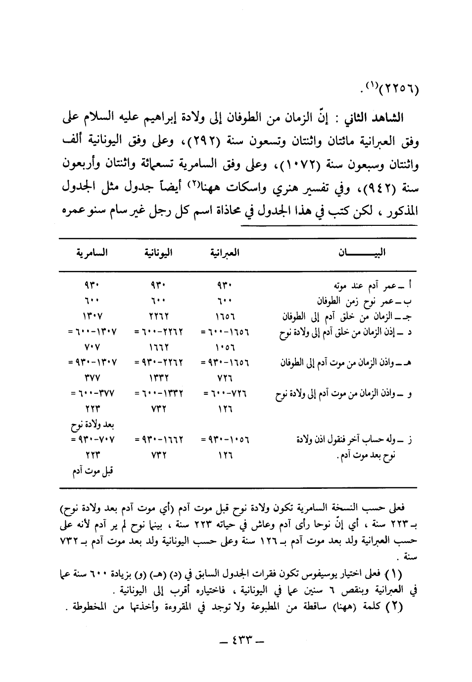 (الشاهد الثاني) أن الزمان من الطوفان إلى ولادة إبراهيم عليه السلام على وفق العبرانية مائتان واثنتان وستعون سنة 29، وعلى وفق اليونانية ألف واثنتان وسبعون سنة 1072، وعلى وفق السامرية تسعمائة واثنتان وأربعون سنة 942، وفي تفسير هنري واسكات أيضاً جدول مثل الجدول المذكور، لكن كتب في هذا الجدول في محاذاة اسم كل رجل غير سام من سني عمره