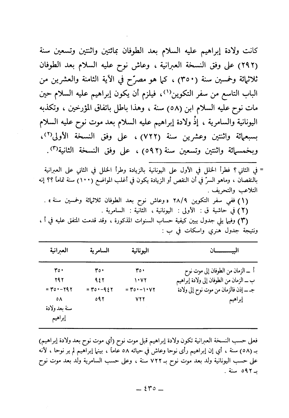 كانت ولادة إبراهيم عليه السلام بعد الطوفان بمائتين واثنتين وتسعين سنة 292 على وفق النسخة العبرانية، وعاش نوح عليه السلام بعد الطوفان ثلثمائة وخمسين سنة 350 كما هو مصرح في الآية الثانية والعشرين من الباب التاسع من سفر التكوين، فيلزم أن يكون إبراهيم عليه السلام حين مات نوح عليه السلام ابن ثمان وخمسين سنة، وهذا باطل باتفاق المؤرخين، ويكذبه اليونانية والسامرية، إذ ولادة إبراهيم عليه السلام بعد موت نوح عليه السلام بسبعمائة واثنتين وعشرين سنة على وفق النسخة الأولى، وبخمسمائة واثنتين وتسعين سنة على وفق النسخة الثانية،
