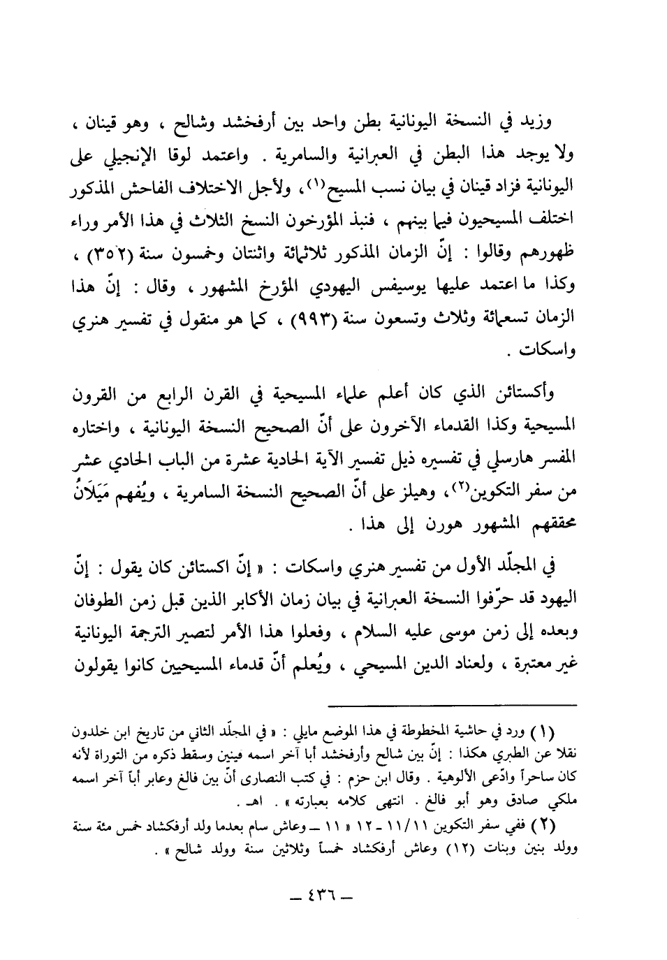 وزيد في النسخة اليونانية بطن واحدبين أرفخشذ وشالخ وهو قينان، ولا يوجد هذا البطن في العبرانية والسامرية، واعتمد لوقا الإنجيلي على اليونانية فزاد قينان في بيان نسب المسيح، ولأجل الاختلاف الفاحش المذكور اختلف المسيحيون فيما بينهم، فنبذ المؤرخون النسخ الثلاث في هذا الأمر وراء ظهورهم، وقالوا إن الزمان المذكور ثلثمائة واثنتان وخمسون سنة 352، وكذا ما اعتمد عليها يوسيفس اليهودي المؤرخ، المشهور وقال إن هذا الزمان تسعمائة وثلاث وتسعون سنة 993، كما هو منقول في تفسير هنري واسكات وأكستائن، الذي كان أعلم العلماء المسيحية في القرن الرابع من القرون المسيحية وكذا القدماء الآخرون، على أن الصحيح النسخة اليونانية، واختاره المفسر (هارسلي) في تفسيره ذيل تفسير الآية الحادية عشرة من سفر التكوين. و (هيلز) على أن الصحيح النسخة السامرية، ويفهم ميلان محققهم المشهور (هورن) إلى هذا.