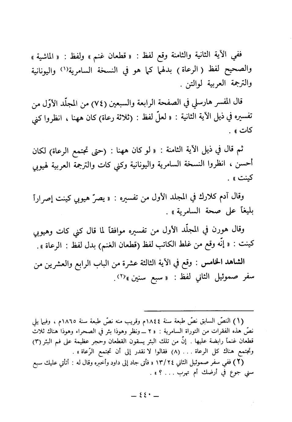ففي الآية الثانية والثامنة وقع لفظ قطعان غنم، ولفظ الماشية، والصحيح لفظ الرعاة بدلهما كما هو في النسخة السامرية واليونانية والترجمة العربية لوالتن، قال المفسر هارسلي في الصفحة الرابعة والسبعين من المجلد الأول من تفسيره في ذيل الآية الثانية: "لعل لفظ ثلاثة رعاة كان ههنا انظروا كني كات" ثم قال في ذيل الآية الثامنة: "لو كان ههنا حتى تجتمع الرعاة لكان أحسن، انظروا النسخة السامرية واليونانية وكني كات والترجمة العربية لهيوبي كينت" وقال آدم كلارك في المجلد الأول من تفسيره: "يصر هيوبي كينت إصراراً بليغاً على صحة السامرية" وقال هورن في المجلد الأول من تفسيره موافقاً لما قال كني كات وهيوبي كينت أنه وقع من غلط الكاتب لفظ قطعان الغنم بدل لفظ الرعاة.