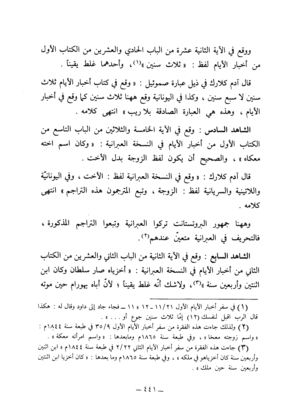 (الشاهد السادس) وقع في الآية الخامسة والثلاثين من الباب التاسع من الكتاب الأول من أخبار الأيام في النسخة العبرانية "وكان اسم أخته معكاه" والصحيح أن يكون لفظ الزوجة بدل الأخت قال آدم كلارك: "وقع في النسخة العبرانية لفظ الأخت، وفي اليونانية واللاطينية والسريانية لفظ الزوجة وتبع المترجمون هذه التراجم" انتهى كلامه، وههنا جمهور البروتستنت نركوا العبرانية وتبعوا التراجم المذكورة فالتحريف في العبرانية متعين عندهم.