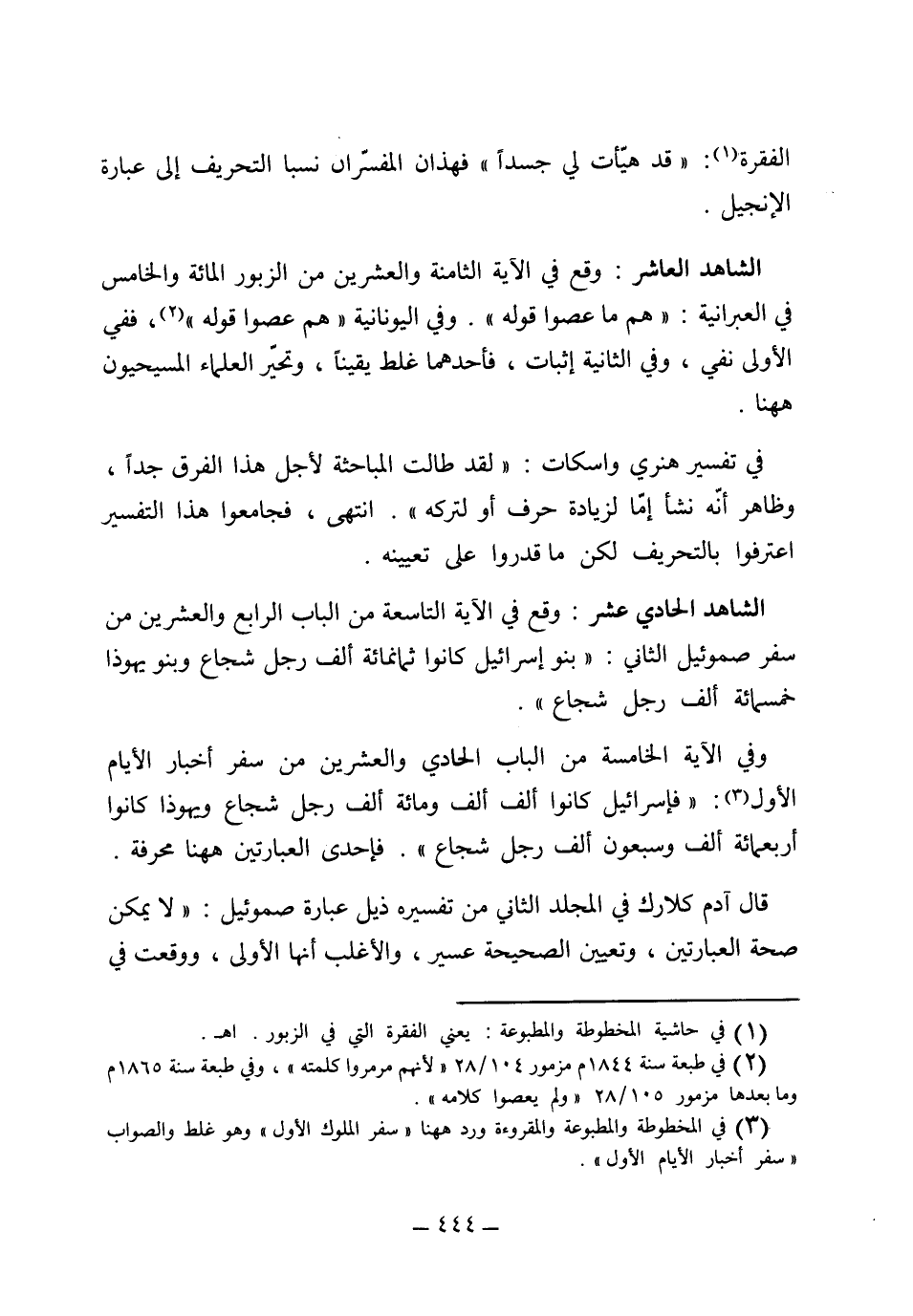 (الشاهد العاشر) وقع في الآية الثامنة والعشرين من الزبور المائة والخامس في العبرانية: "هم ما عصوا قوله" وفي اليونانية "هم عصوا قوله" ففي الأول نفي والثانية إثبات، فأحدهما غلط يقيناً، وتحير العلماء المسيحيون ههنا في تفسير هنري واسكات: "لقد طالت المباحثة لأجل هذا الفرق جداً وظاهر أنه نشأ إما لزيادة حرف أو لتركه" فجامعو هذا التفسير اعترفوا بالتحريف، لكن ما قدروا على تعيينه.