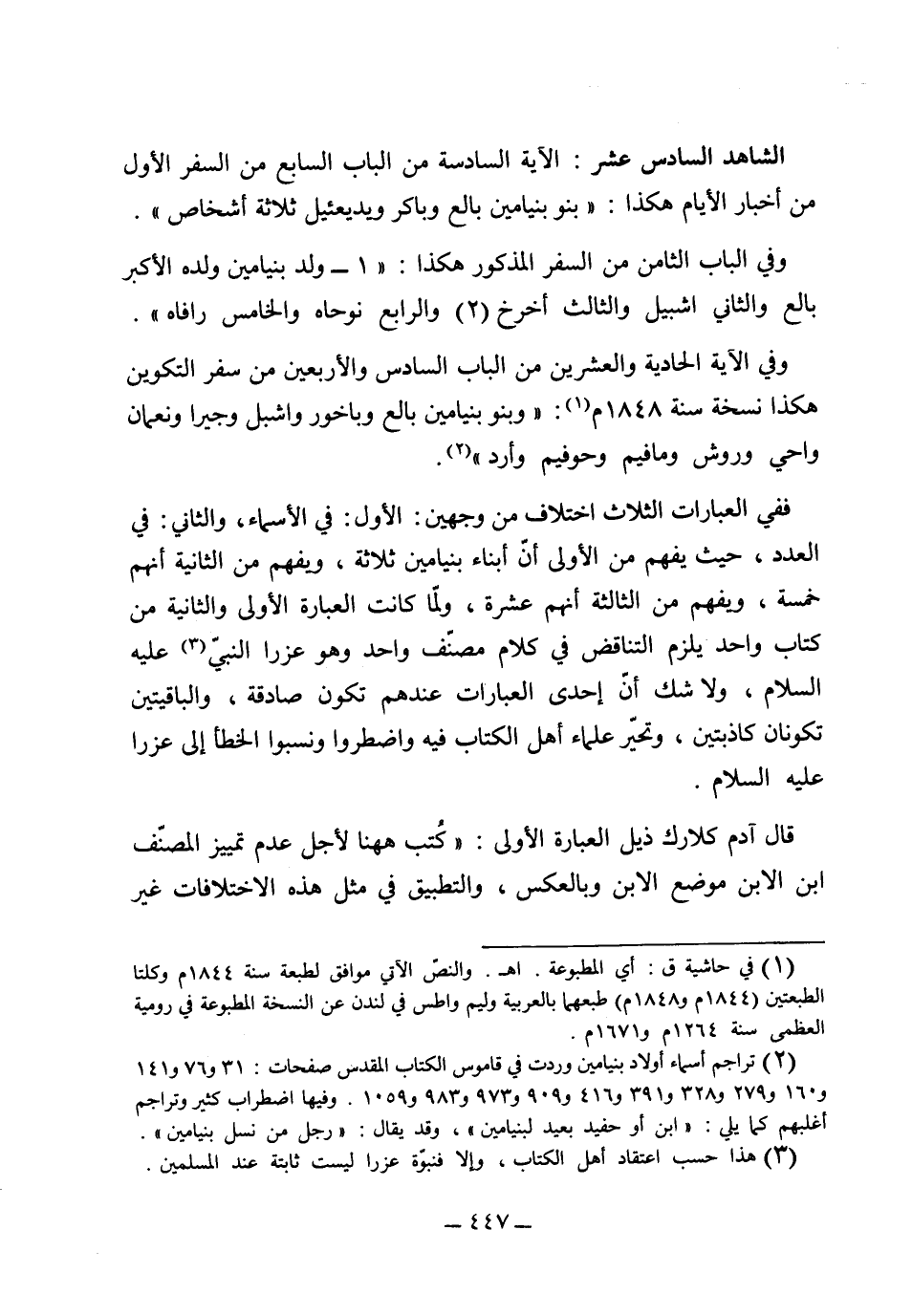 (الشاهد السادس عشر) الآية السادسة من الباب السابع من السفر الأول من أخبار الأيام هكذا: "بنو بنيامين بلع وبكر ويدبع بيل ثلاثة أشخاص" وفي الباب الثامن من السفر المذكور هكذا: [1] "ولد بنيامين ولده الأكبر بالع والثاني إشبيل والثالث أحْرَح" [2] "والرابع نوحاه والخامس رافاه" وفي الآية الحادية والعشرين من الباب السادس والأربعين من سفر التكوين هكذا: "نسخة سنة 1848 بنو بنيامين بالع وباخور وإشبل وجيرا ونعمان واحي وروش ومافيم وحوفيم وارد" ففي العبارات الثلاث اختلاف من وجيهن الأول في الأسماء، والثاني في العدد حيث يفهم من الأولى أن أبناء بنيامين ثلاثة، ويفهم من الثانية أنهم خمسة، ويفهم من الثالثة أنهم عشرة، ولما كانت العبارة الأولى والثانية من كتاب واحد يلزم التناقض في كلام مصنف واحد، وهو عزرا النبي عليه السلام، ولا شك أن إحدى العبارات عندهم تكون صادقة، والباقيتين تكونان كاذبتين، وتحير علماء أهل الكتاب فيه واضطروا ونسبوا الخطأ إلى عزرا عليه السلام، قال آدم كلارك ذيل العبارة الأولى: "كتب ههنا لأجل عدم التميز للمصنف ابن الابن موضع الابن وبالعكس، والتطبيق في مثل هذه الاختلافات غير