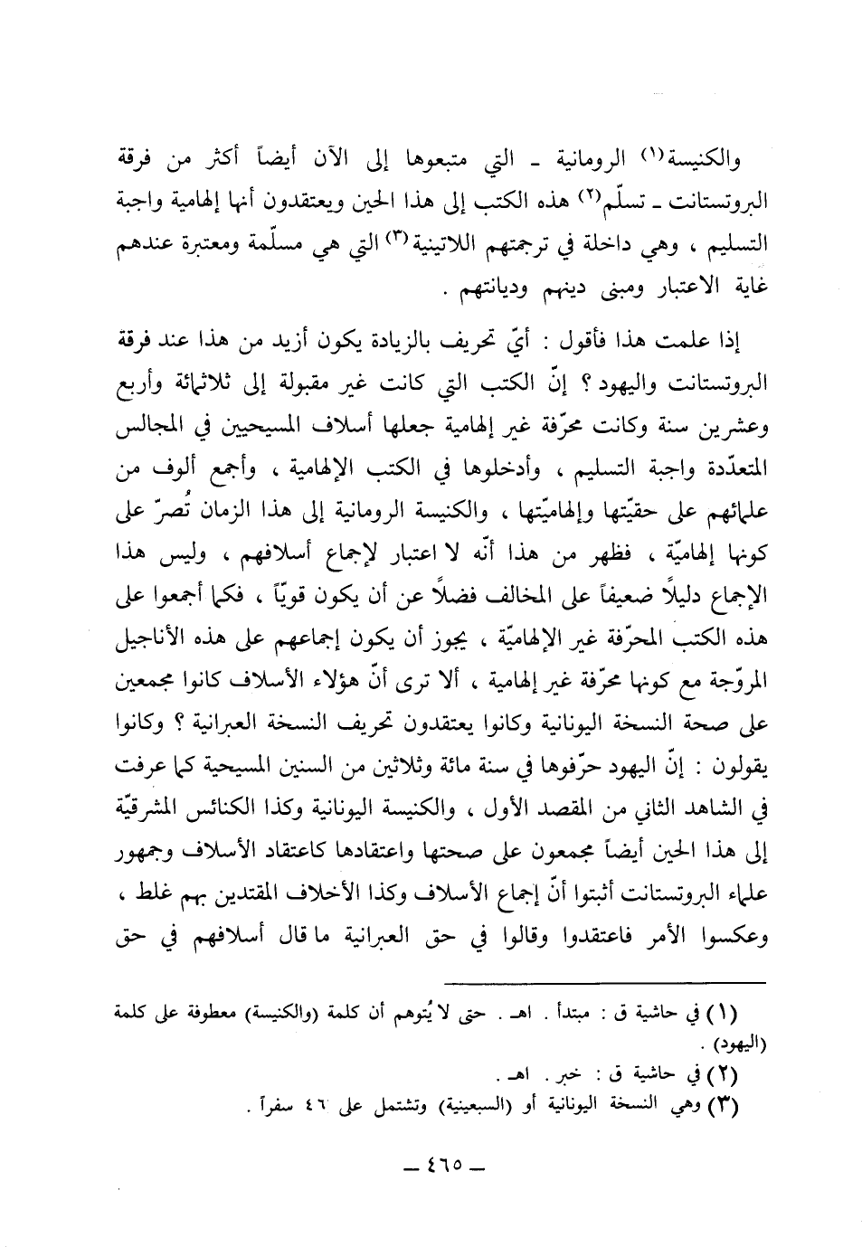 والكنيسة الرومانية التي متبوعها إلى الآن أيضاً أكثر من فرقة البروتستنت تسلم هذه الكتب إلى هذا الحين، ويعتقدون أنها إلهامية واجبة التسليم، وهي داخلة في ترجمتهم اللاطينية التي هي مسلمة ومعتبرة عندهم غاية الاعتبار، ومبنى دينهم ودياناتهم. إذا علمتَ هذا فأقول: أي تحريف بالزيادة يكون أزيد من هذا؟. عند فرقة البروتستنت واليهود أن الكتب التي كانت غير مقبولة إلى ثلثمائة وأربع وعشرين سنة وكانت محرفة غير إلهامية جعلها أسلاف المسيحيين في المجالس المتعددة واجبة التسليم، وأدخلوها في الكتب الإلهامية، وأجمع الألوف من علمائهم على حقيقتها وإلهاميتها، والكنيسة الرومانية إلى [ص 238] هذا الزمان تصر على كونها إلهامية، فظهر من هذا أنه لا اعتبار لإجماع أسلافهم، وليس هذا الإجماع دليلاً ضعيفاً على المخالف فضلاً عن أن يكون قوياً، فكما أجمعوا على هذه الكتب المحرفة الغير الإلهامية يجوز أن يكون إجماعهم على هذه الأناجيل المروّجة مع كونها محرفة غير إلهامية، ألا ترى أن هؤلاء الأسلاف كانوا مجمعين على صحة النسخة اليونانية وكانوا يعتقدون تحريف النسخة العبرانية، وكانوا يقولون إن اليهود حرفوها في سنة مائة وثلاثين من السنين المسيحية، كما عرفت في الشاهد الثاني من المقصد الأول.
