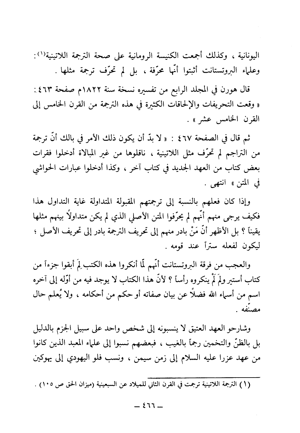 اليونانية، وكذلك أجمع الكنيسة الرومانية على صحة الترجمة اللاطينية وعلماء البروتسنت أثبتوا أنها محرفة، بل لم تحرف ترجمة مثلها. قال هورن في المجلد الرابع من تفسيره نسخة سنة 1822 صفحة 463: "وقع التحريفات والإلحاقات الكثيرة في هذه الترجمة من القرن الخامس إلى القرن الخامس عشر" ثم قال في الصفحة 467: "لا بد أن يكون ذلك الأمر في بالك أن ترجمة من التراجم لم تحرَّف مثل اللاطينية.