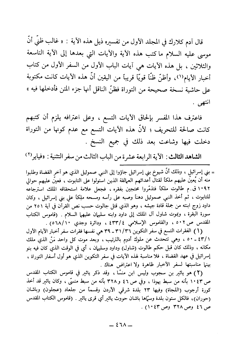 قال آدم كلارك في المجلد الأول من تفسيره ذيل هذه الآية: "غالب ظني أن موسى عليه السلام ما كتب هذه الآية والآيات التي بعدها إلى الآية التاسعة والثلاثين، بل هذه الآيات هي آيات الباب الأول من السفر الأول من كتاب أخبار الأيام، وأظن ظناً قوياً قريباً من اليقين أن هذه الآيات كانت مكتوبة على حاشية نسخة صحيحة من التوراة، فظن الناقل أنها جزء من المتن فأدخلها فيه" فاعترف هذا المفسر بإلحاق الآيات التسع، وعلى اعترافه يلزم أن كتبهم كانت صالحة للتحريف، لأن هذه الآيات التسع، مع عدم كونها من التوراة دخلت فيه وشاعت بعد ذلك في جميع النسخ.
