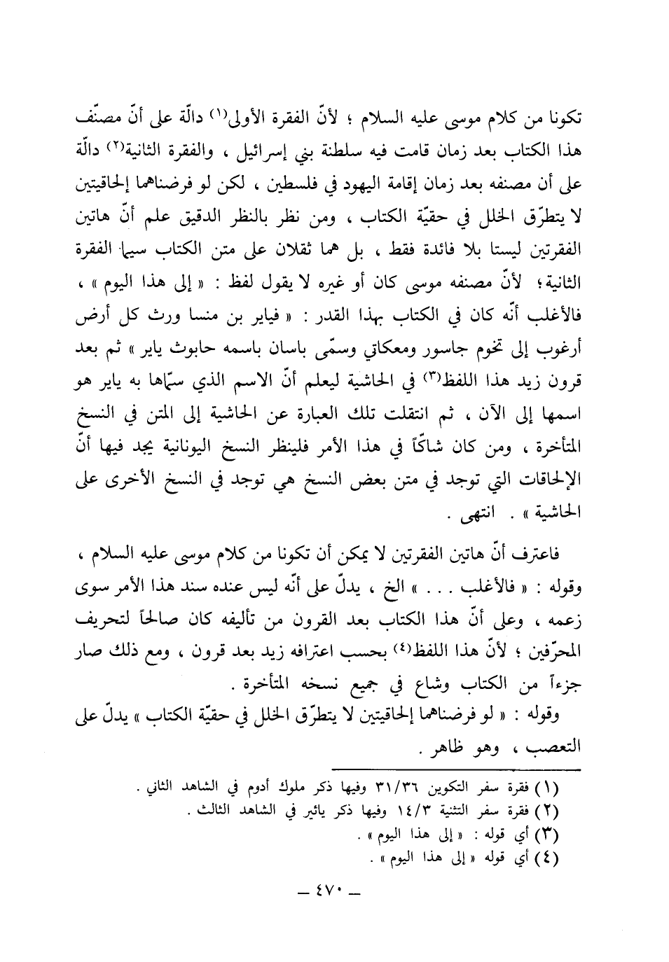 تكونا من كلام موسى عليه السلام، لأن الفقرة الأولى دالة على أن مصنف هذا الكتاب بعد زمان قامت فيه سلطنة بني إسرائيل، والفقرة الثانية دالة على أن مصنفه بعد زمان إقامة اليهود في فلسطين، لكن لو فرضناهما إلحاقيتين لا يتطرق الخلل في حقيقة الكتاب، ومن نظر بالنظر الدقيق علم أن هاتين الفقرتين ليستا بلا فائدة فقط بل هما ثِقلان على متن الكتاب، سيما الفقرة الثانية لأن مصنفه موسى كان أو غيره لا يقول لفظ إلى هذا اليوم، فالأغلب أنه كان في الكتب بهذا القدر فياير بن مَنَساوَرِث كل أرض أرغوب إلى تخوم جاسور ومعكاتي، وسمى باسان باسمه جالوث ياير، ثم بعد قرون زيد هذا اللفظ في الحاشية ليُعلم أن الاسم الذي سماها ياير به هو اسمها إلى الآن، ثم انتقلت تلك العبارة عن الحاشية إلى المتن في النسخ المتأخرة، ومَنْ كان شاكاً في هذا الأمر فلينظر النسخ اليونانية يجد فيها أن الإلحاقات التي توجد في متن بعض النسخ هي توجد في النسخ الأخرى على الحاشية".