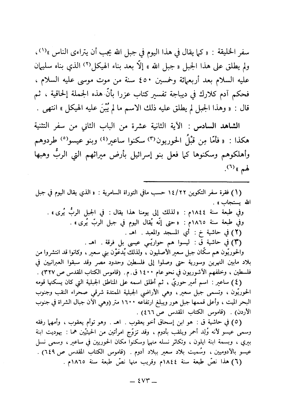 (الشاهد السادس) الآية الثانية عشرة من الباب الثاني من سفر الاستثناء هكذا: "فأما من قبلُ الحواريون سكنوا ساعير، وبنو عيسو طردوهم وأهلكوهم وسكنوها كما فعل بنو إسرائيل بأرض ميراثهم التي وهبها لهم"