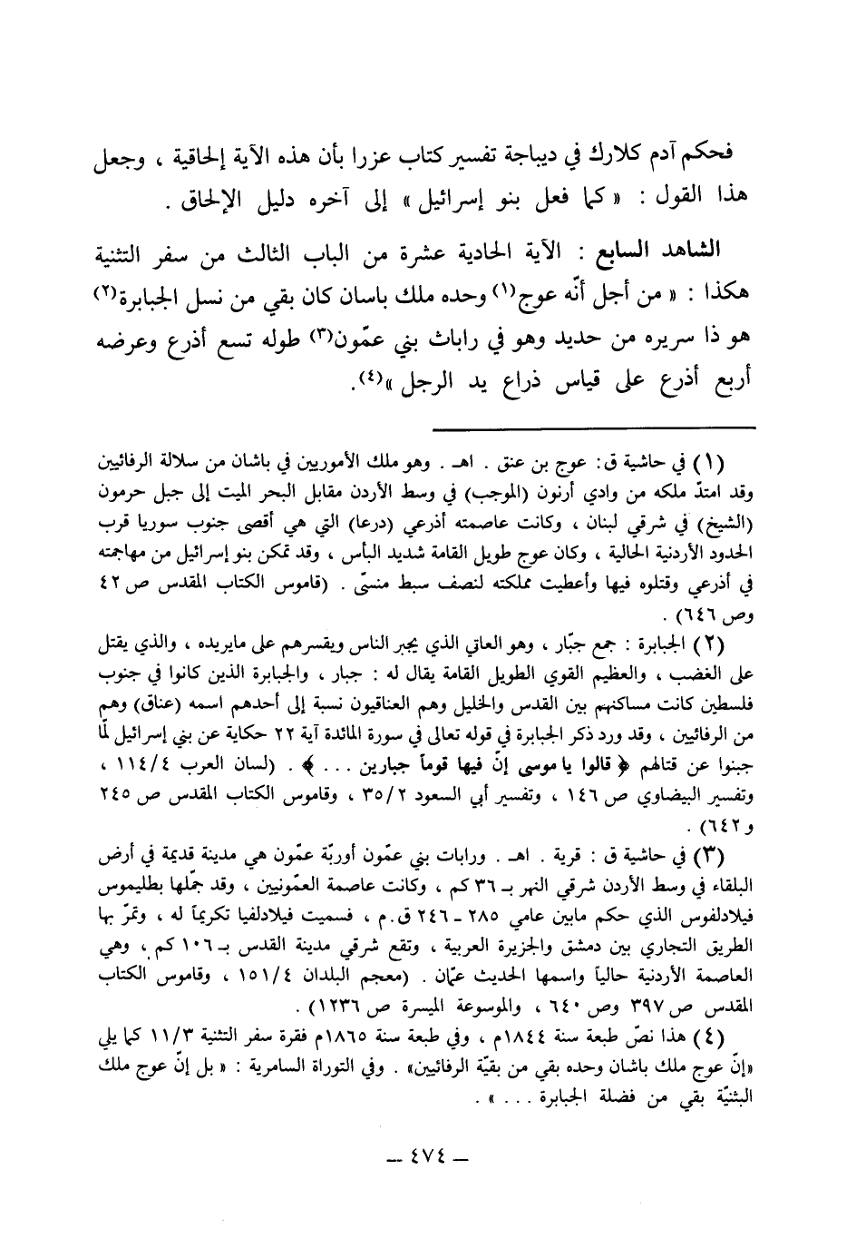 (الشاهد السابع) الآية الحادية عشرة من الباب الثالث من سفر الاستثناء هكذا: "من أجل أنه عُوج وحده مَلِكُ باسان كان بقي من نسل الجبابرة هذا سريره من حديد، وهو في راباث بني عمون، طوله تسع أذرع وعرضه أربع أذرع على قياس ذراع اليد"