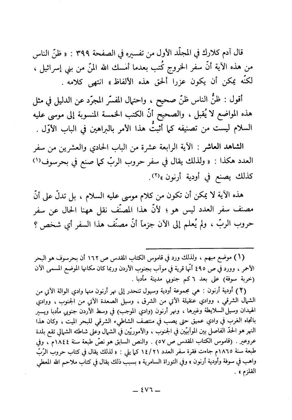 (الشاهد العاشر) الآية الرابعة عشرة من الباب الحادي والعشرين من سفر العدد هكذا: "ولذلك يقال في سفر حروب الرب كما صنع في بحر سوف كذلك يصنع في أودية أرنون" هذه الآية لا يمكن أن تكون من كلام موسى بل تدل على أن مصنف سفر العدد ليس هو لأن هذا المصنف نقل ههنا الحال عن سِفْر حروب الرب، ولم يعلم إلى الآن جَزْماً أن مصنف هذا السفر أي شخص،